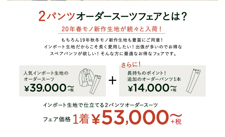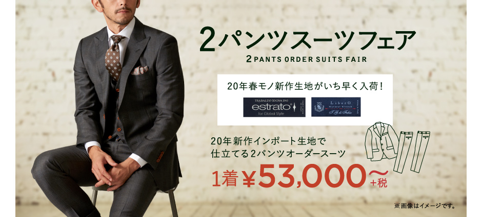 フェア情報のページです。グローバルスタイル(Global Style)では、本格オーダースーツが1着2万円台~!約5,000種類の生地をリーズナブルな価格でご用意しております。東京都・神奈川県(横浜)・埼玉県(大宮)・千葉県・静岡県・愛知県(名古屋)・大阪府(梅田/なんば)・奈良県・京都府・兵庫県(神戸)・広島県・福岡県(天神/博多/北九州)・北海道(札幌)・宮城県(仙台)・熊本県など全国40店舗に展開。