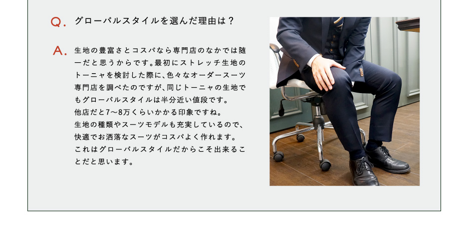 より多くのお客様にオーダーの魅力をお楽しみいただけるお店作りをモットーとするグローバルスタイルの最大の特徴は業界初の「プライベートフィッティングルーム」です。オーダーは既製服と違い、採寸、生地選びとお客様にとってお時間のかかる工程がありますが、その時間を最大にお楽しみいただけるのが当店の特徴です。ご家族、ご友人、会社の同僚の方々と気兼ねなく貸切オーダーをお楽しみください。