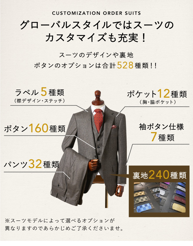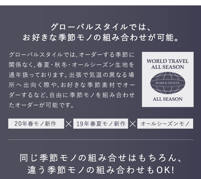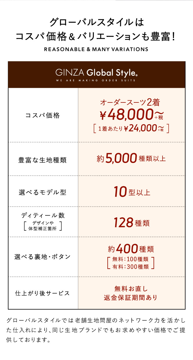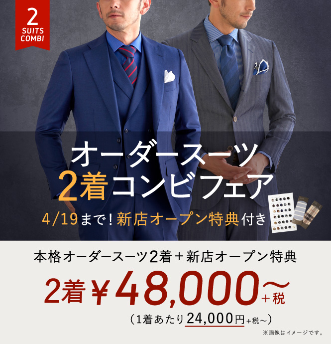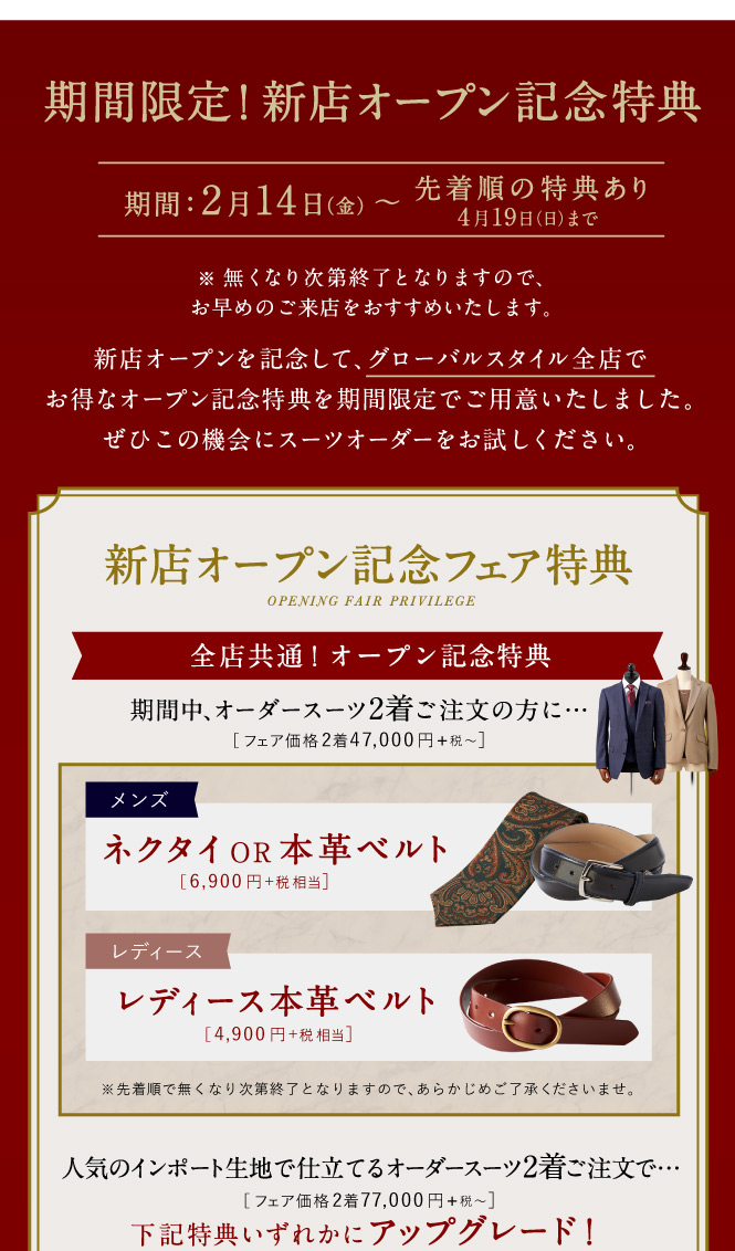 フェア情報のページです。グローバルスタイル(Global Style)では、本格オーダースーツが1着2万円台~!約5,000種類の生地をリーズナブルな価格でご用意しております。東京都・神奈川県(横浜)・埼玉県(大宮)・千葉県・静岡県・愛知県(名古屋)・大阪府(梅田/なんば)・奈良県・京都府・兵庫県(神戸)・広島県・福岡県(天神/博多/北九州)・北海道(札幌)・宮城県(仙台)・熊本県など全国40店舗に展開。