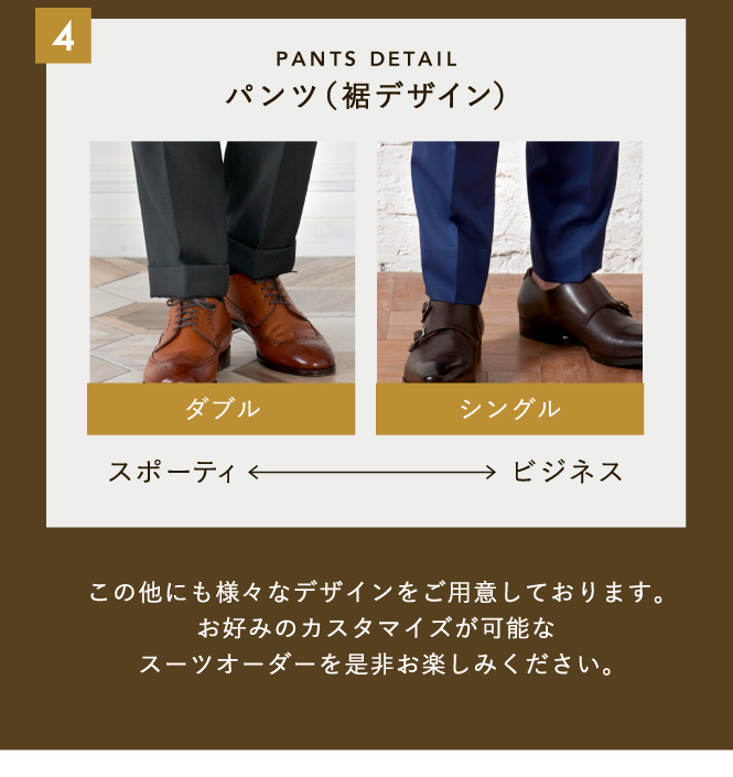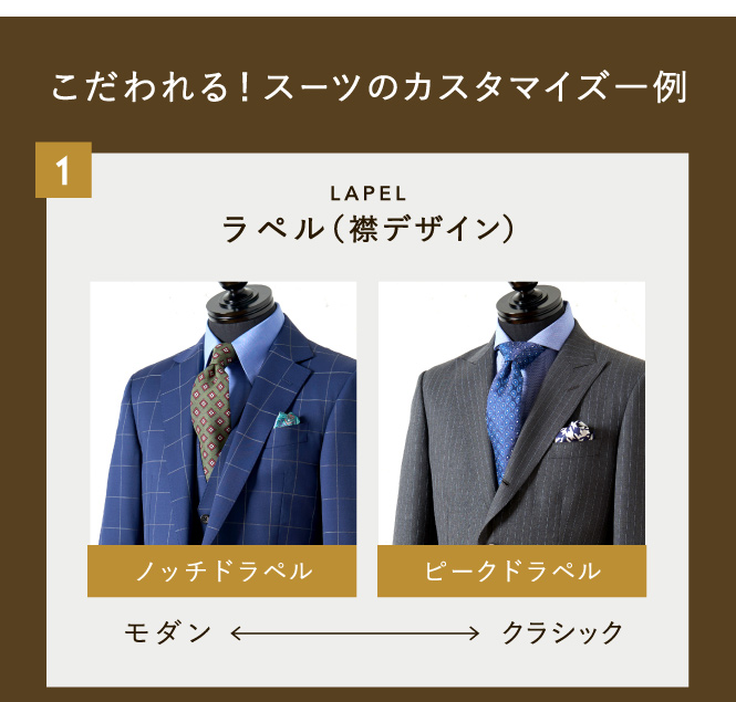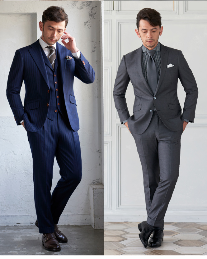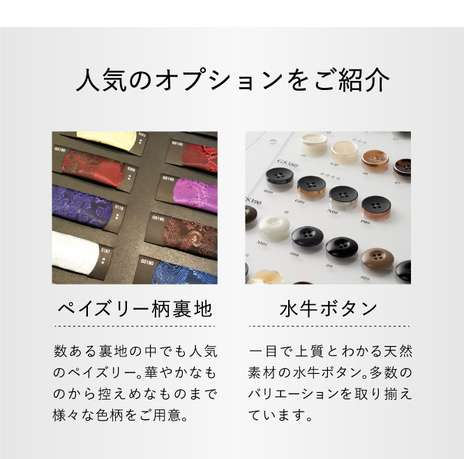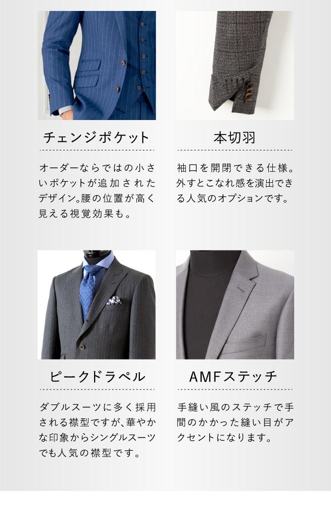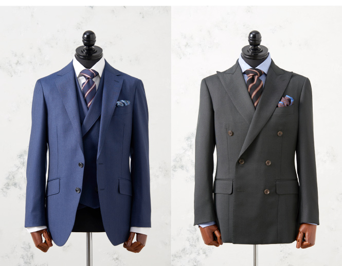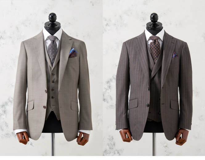 従来からある重厚な英国風仕立てを アレンジして薄めのパットやソフトな毛芯を用いています。 デザイン的にも高めの釦位置や強調された 裾のカッタウェイライン、スラントやチェンジポケットなど ブリテッシュスタイルの新しい息吹を体感して下さい。