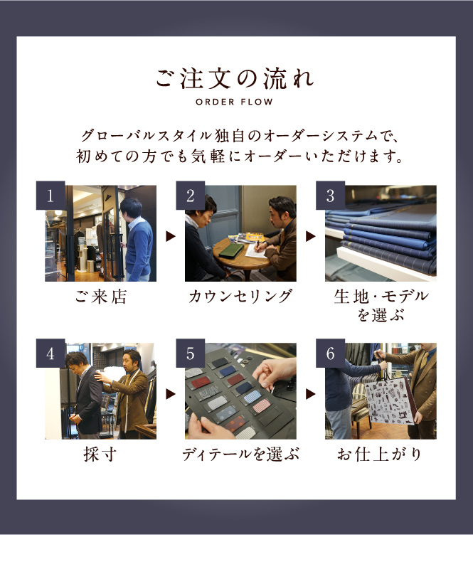 より多くのお客様にオーダーの魅力をお楽しみいただけるお店作りをモットーとするグローバルスタイルの最大の特徴は業界初の「プライベートフィッティングルーム」です。オーダーは既製服と違い、採寸、生地選びとお客様にとってお時間のかかる工程がありますが、その時間を最大にお楽しみいただけるのが当店の特徴です。ご家族、ご友人、会社の同僚の方々と気兼ねなく貸切オーダーをお楽しみください。
