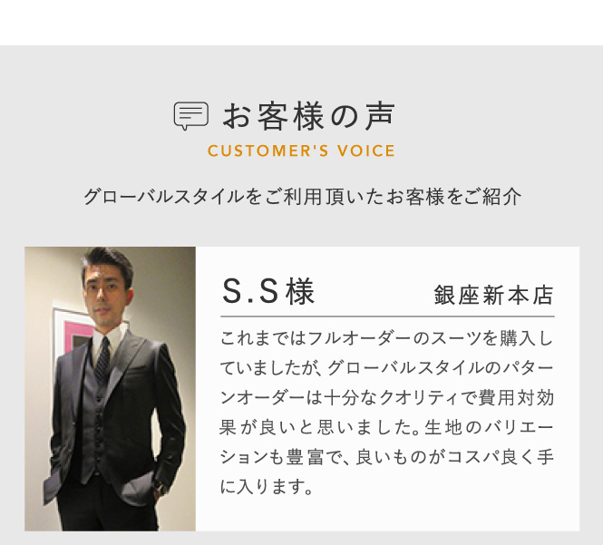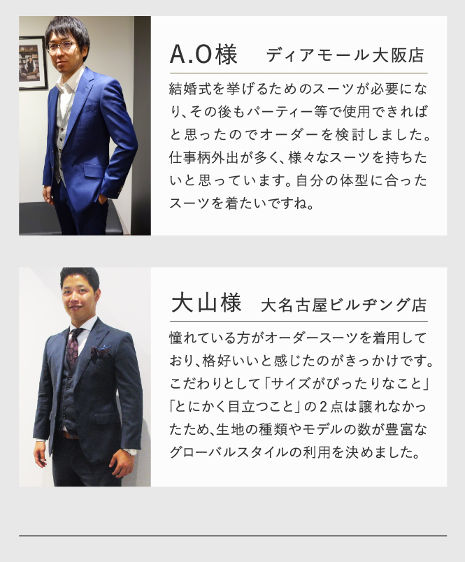 オーダースーツを快適にお作りいただくためのグローバルスタイル独自のサービスです。無料でご使用いただけますのでお気軽にご予約ください。