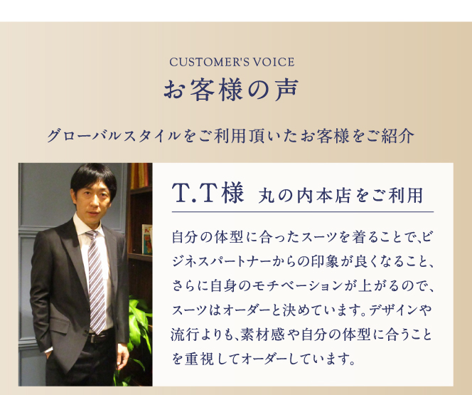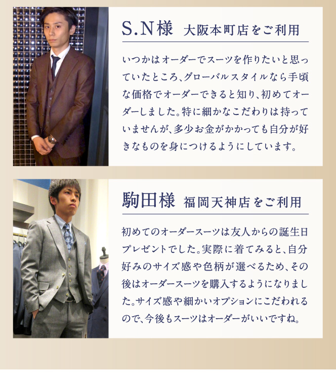 オーダースーツを快適にお作りいただくためのグローバルスタイル独自のサービスです。無料でご使用いただけますのでお気軽にご予約ください。
