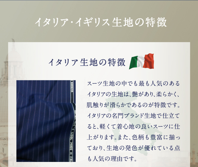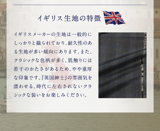従来からある重厚な英国風仕立てを アレンジして薄めのパットやソフトな毛芯を用いています。 デザイン的にも高めの釦位置や強調された 裾のカッタウェイライン、スラントやチェンジポケットなど ブリテッシュスタイルの新しい息吹を体感して下さい。