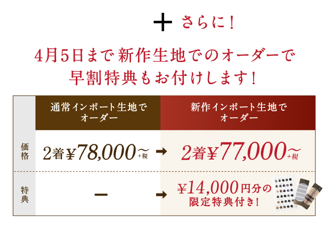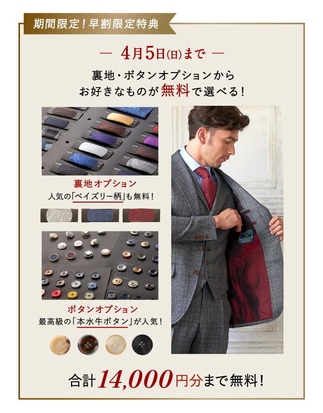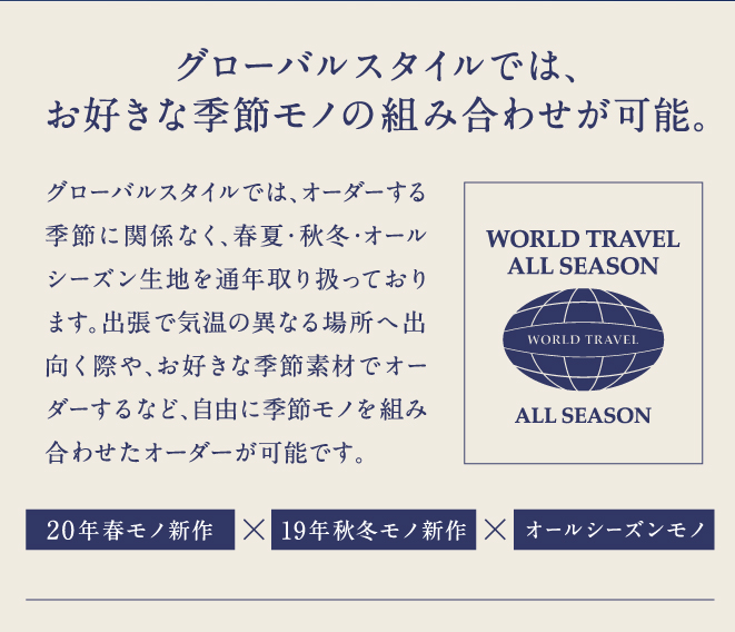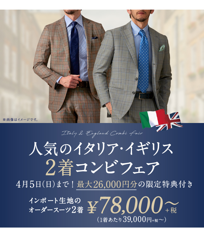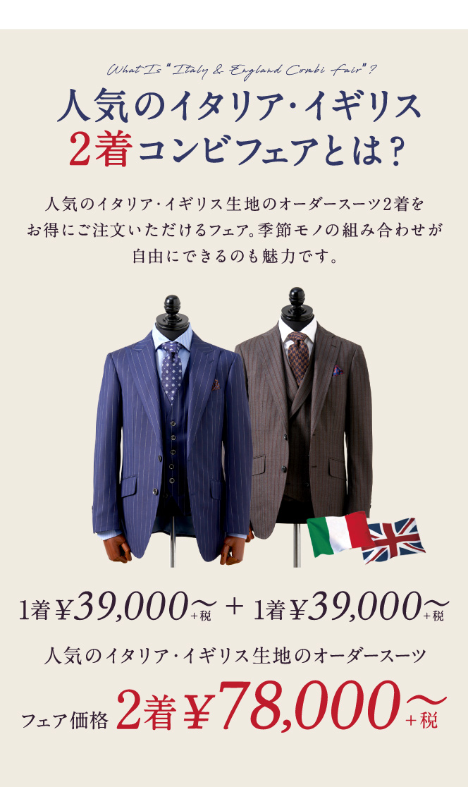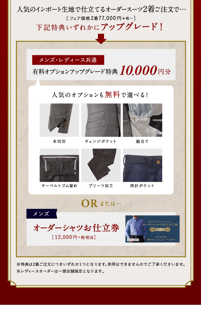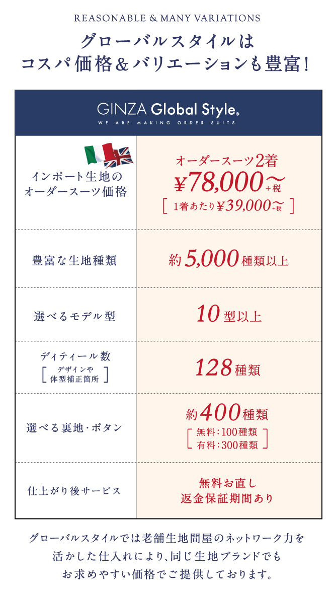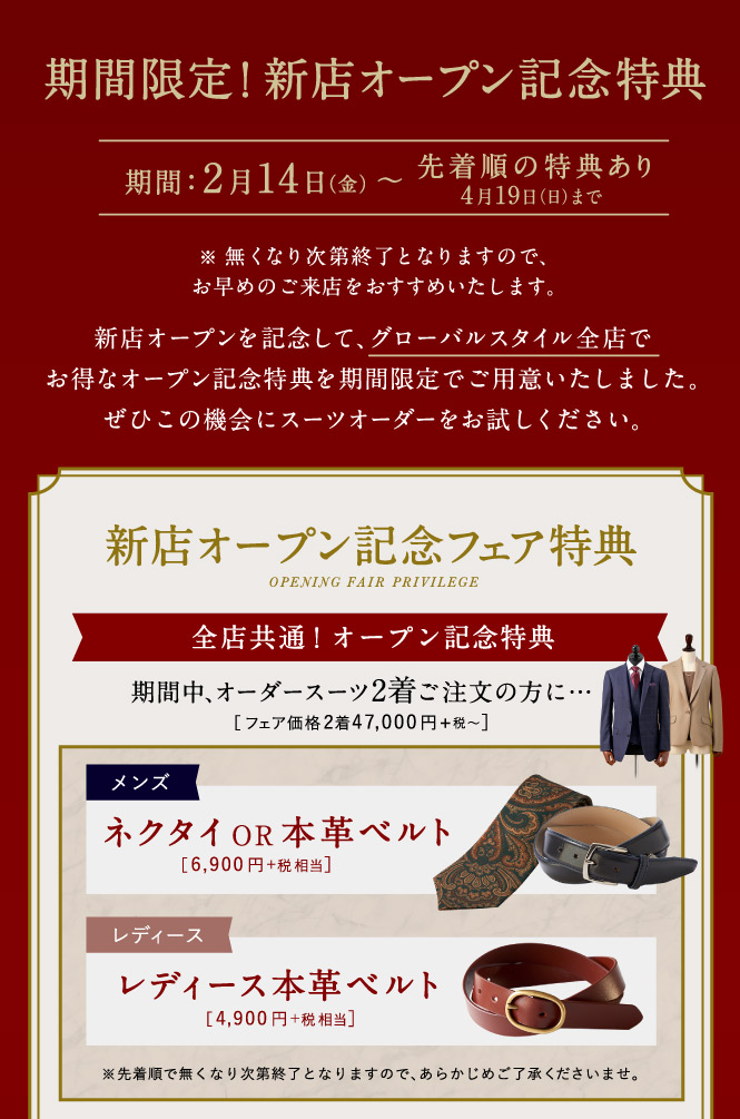 フェア情報のページです。グローバルスタイル(Global Style)では、本格オーダースーツが1着2万円台~!約5,000種類の生地をリーズナブルな価格でご用意しております。東京都・神奈川県(横浜)・埼玉県(大宮)・千葉県・静岡県・愛知県(名古屋)・大阪府(梅田/なんば)・奈良県・京都府・兵庫県(神戸)・広島県・福岡県(天神/博多/北九州)・北海道(札幌)・宮城県(仙台)・熊本県など全国40店舗に展開。