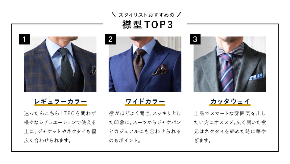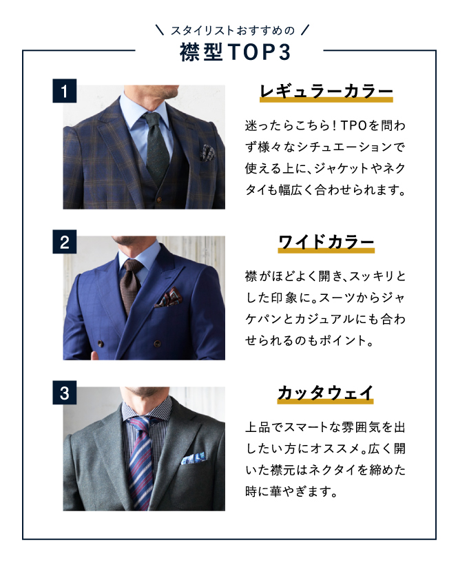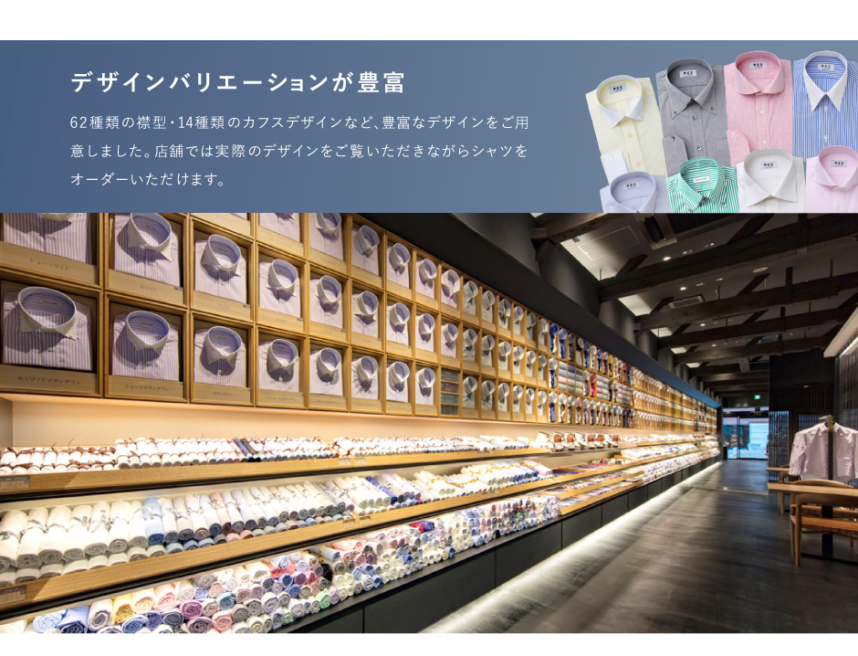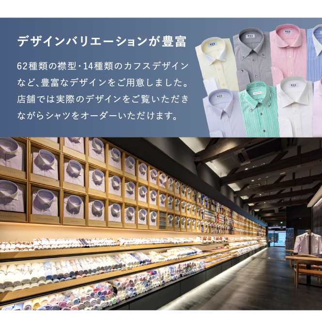 モードからトラッドまでお好みのテイストやTPOに合わせて、62種類の襟型をお選びいただけます。 ※一部有料オプションがございます