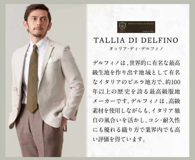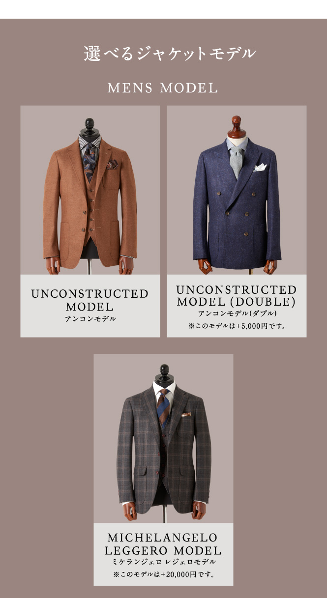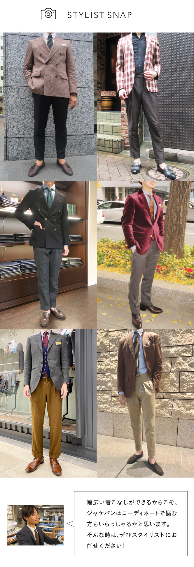 従来からある重厚な英国風仕立てを アレンジして薄めのパットやソフトな毛芯を用いています。 デザイン的にも高めの釦位置や強調された 裾のカッタウェイライン、スラントやチェンジポケットなど ブリテッシュスタイルの新しい息吹を体感して下さい。