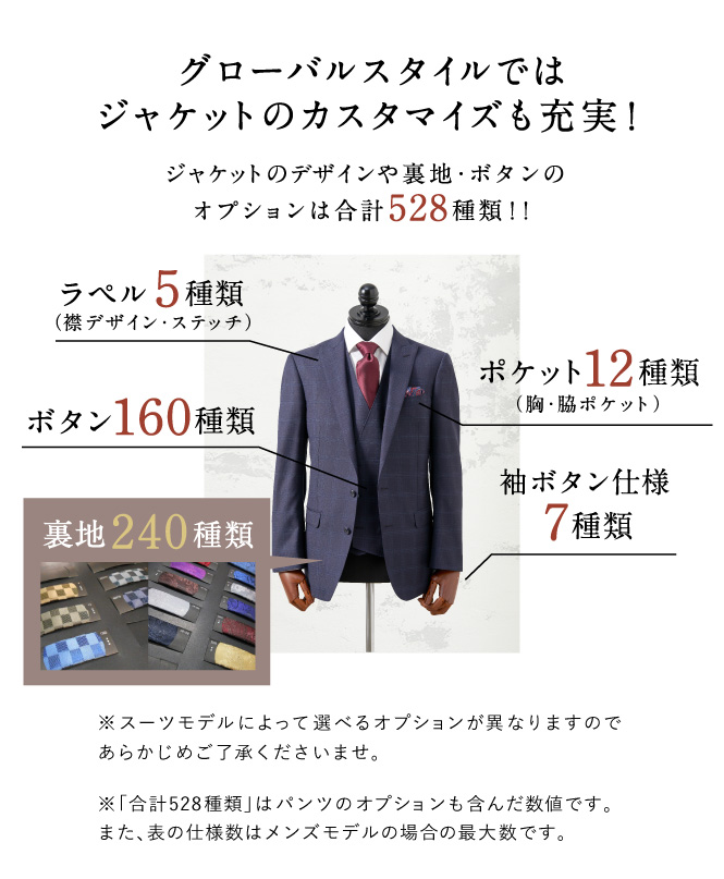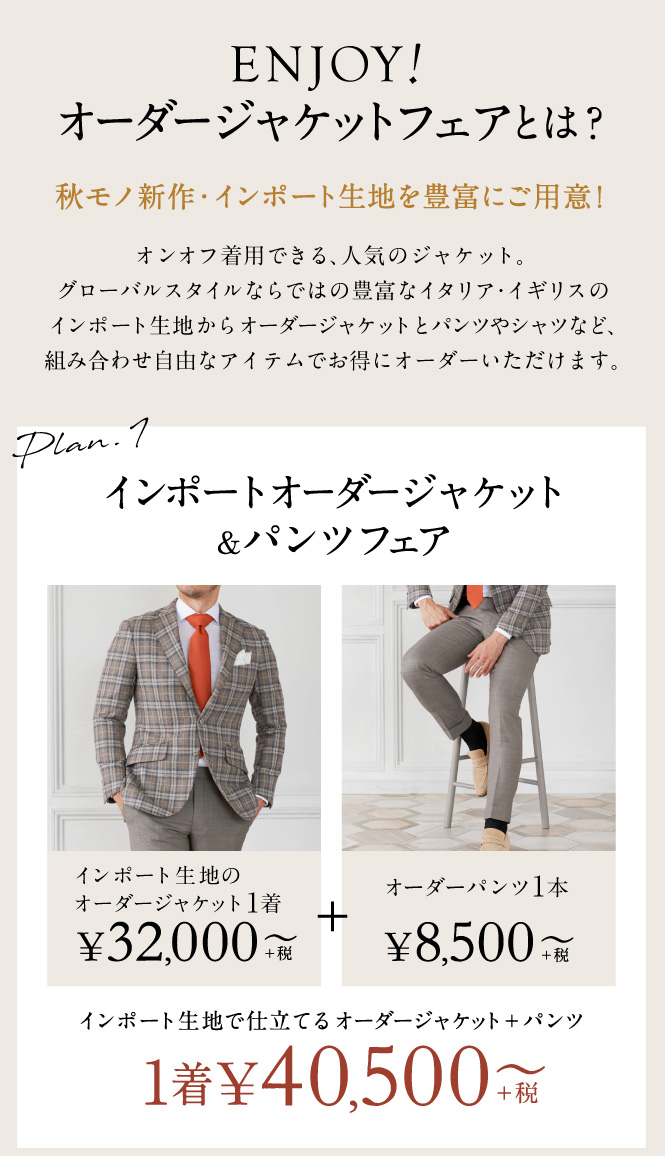 フェア情報のページです。グローバルスタイル(Global Style)では、本格オーダースーツが1着2万円台~!約5,000種類の生地をリーズナブルな価格でご用意しております。東京都・神奈川県(横浜)・埼玉県(大宮)・千葉県・静岡県・愛知県(名古屋)・大阪府(梅田/なんば)・奈良県・京都府・兵庫県(神戸)・広島県・福岡県(天神/博多/北九州)・北海道(札幌)・宮城県(仙台)・熊本県など全国40店舗に展開。