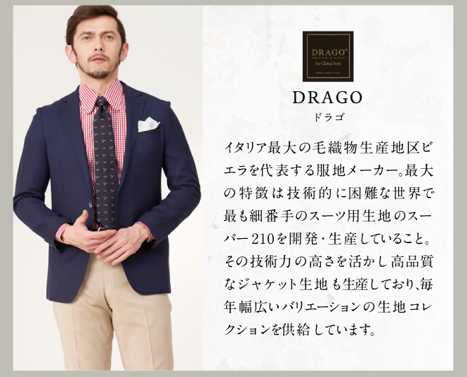 ハイゴージ、9.5cm幅のワイドピークドラペルが70年代のコンチネンタルスタイルを彷彿させる男性らしさを強調し、現代的な仕立ての軽さやタイト感あるシルエットによりクラシックとモダンの絶妙なバランス感を生み出しています。