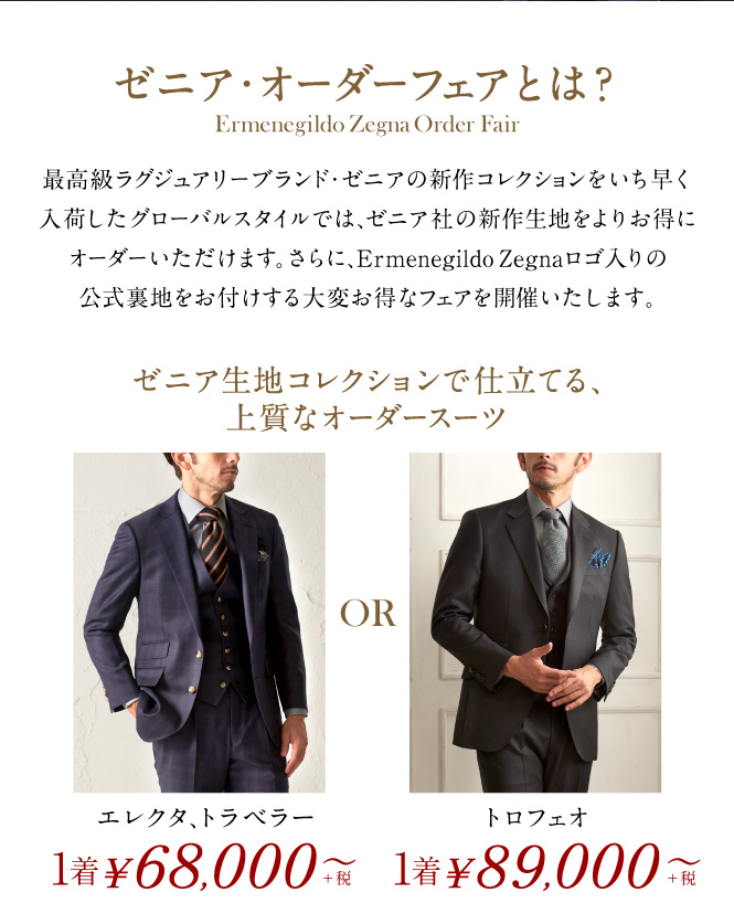 フェア情報のページです。国内最高峰のオーダースーツを東京・大阪・名古屋でコスパ価格で販売。 ジャストフィットするオーダースーツならグローバルスタイルへ。お客様の要望に合わせたオーダーシャツ、オーダーシューズなども取り扱っております。