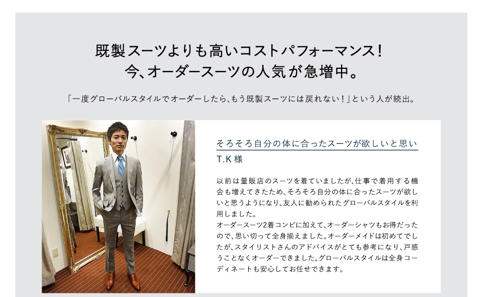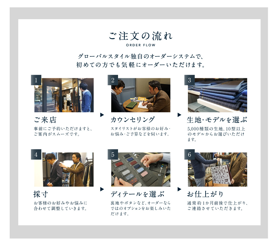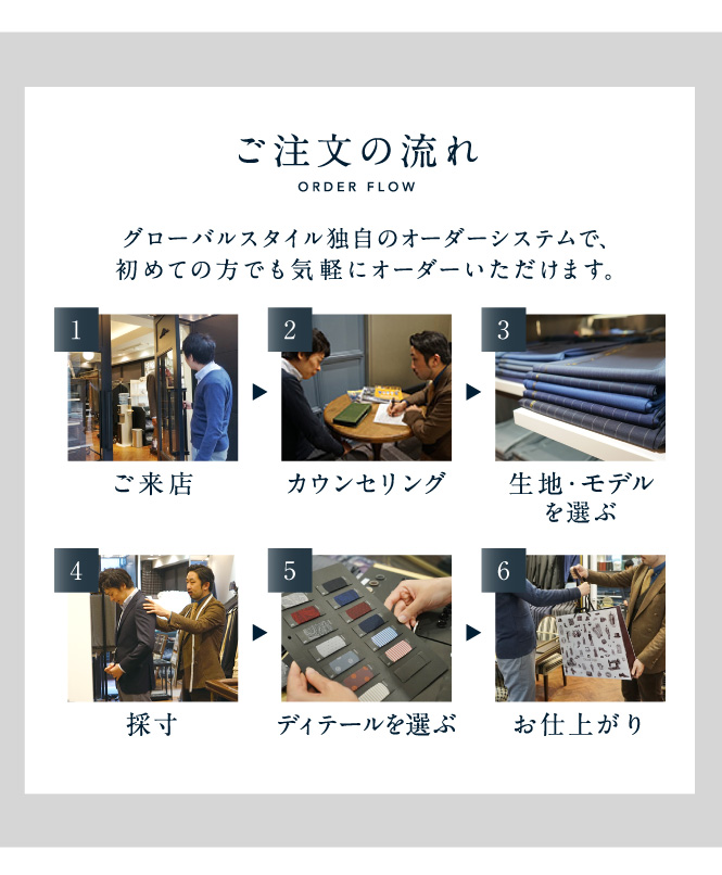 より多くのお客様にオーダーの魅力をお楽しみいただけるお店作りをモットーとするグローバルスタイルの最大の特徴は業界初の「プライベートフィッティングルーム」です。オーダーは既製服と違い、採寸、生地選びとお客様にとってお時間のかかる工程がありますが、その時間を最大にお楽しみいただけるのが当店の特徴です。ご家族、ご友人、会社の同僚の方々と気兼ねなく貸切オーダーをお楽しみください。