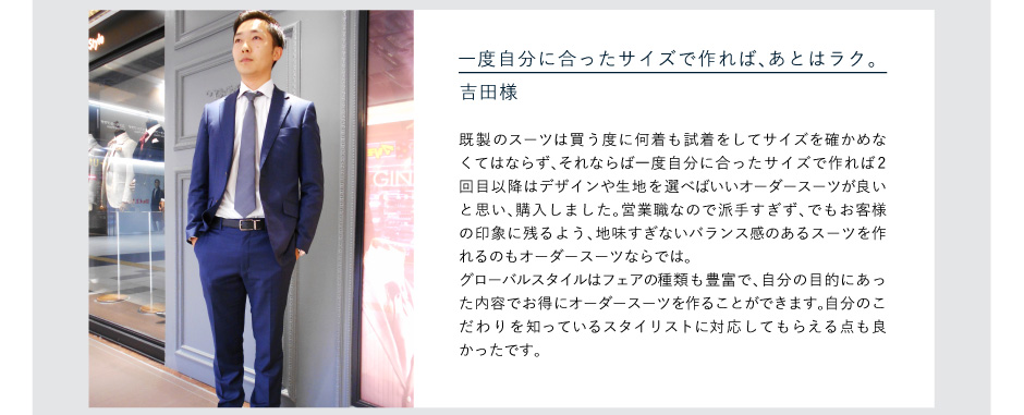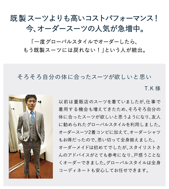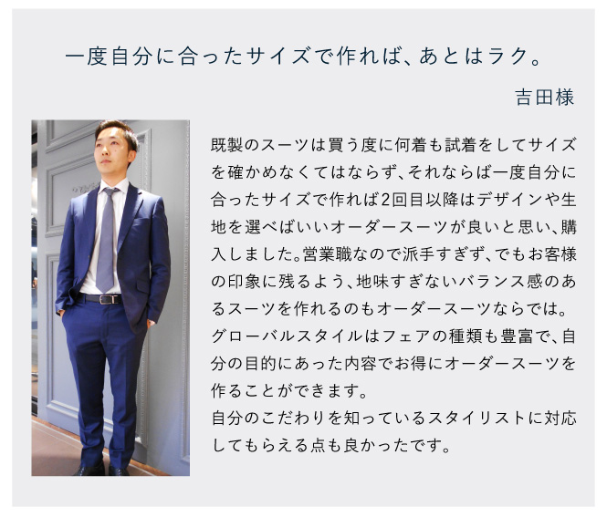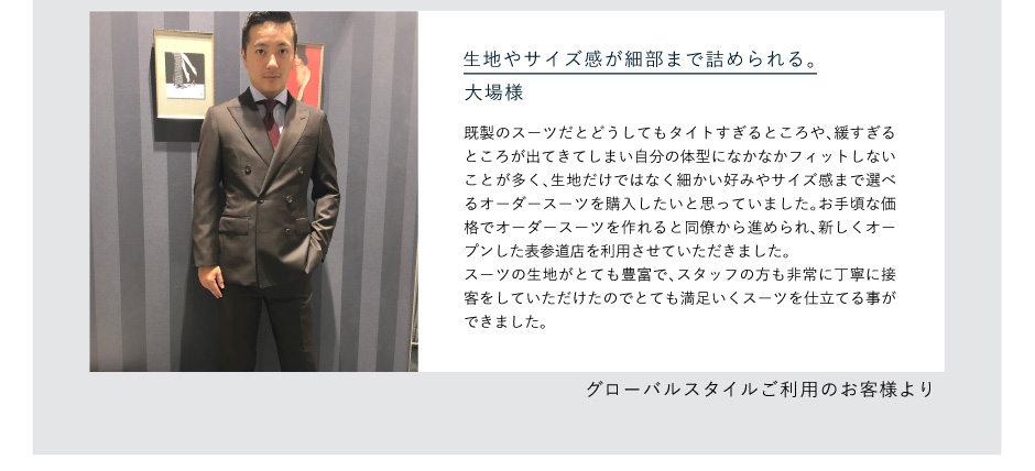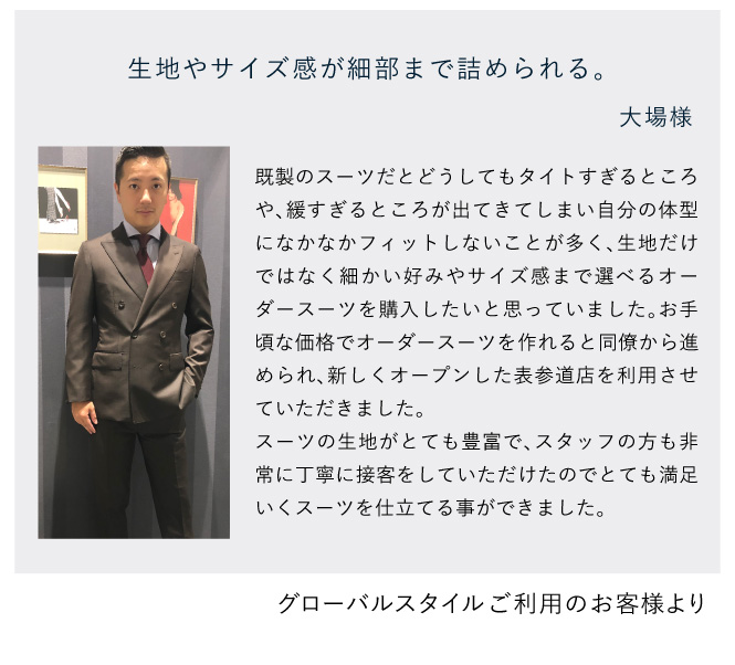 オーダースーツを快適にお作りいただくためのグローバルスタイル独自のサービスです。無料でご使用いただけますのでお気軽にご予約ください。