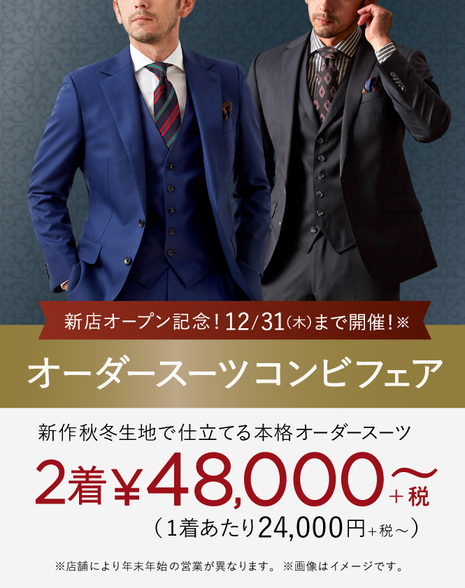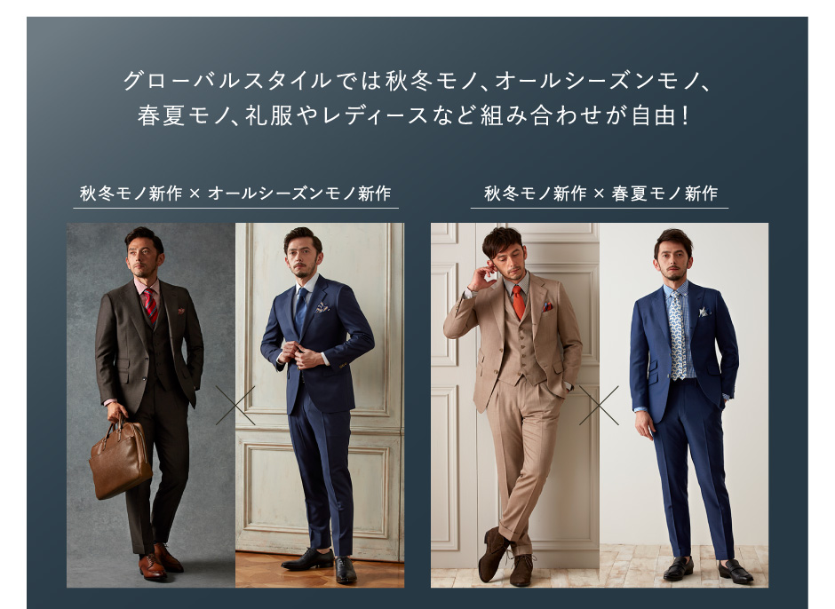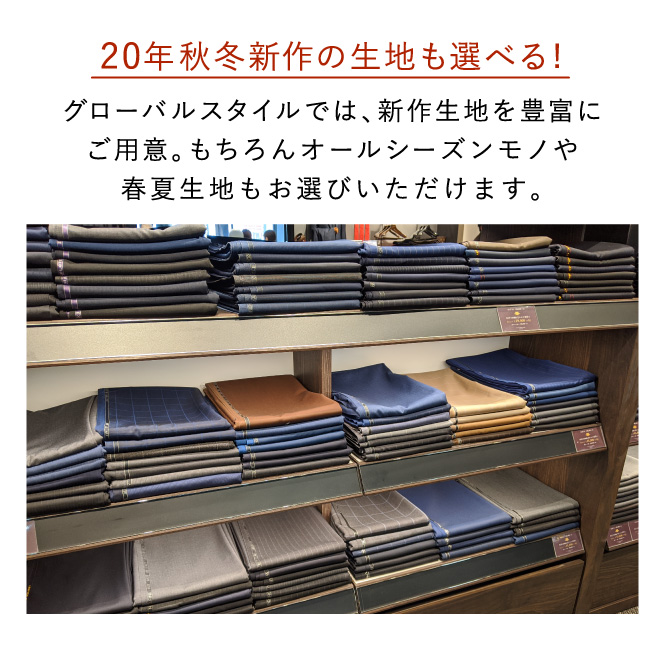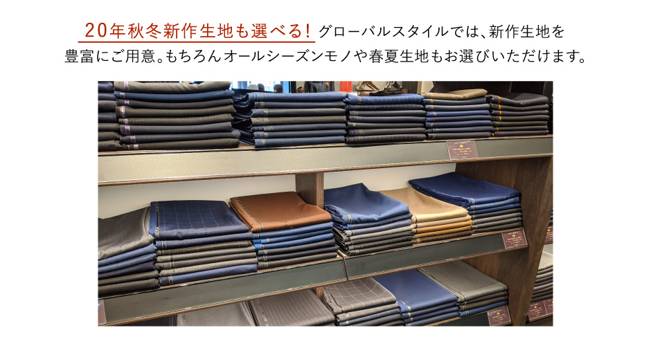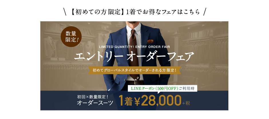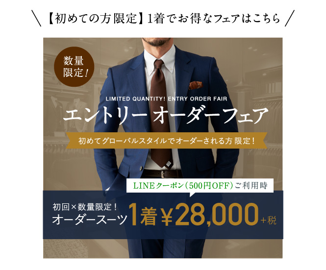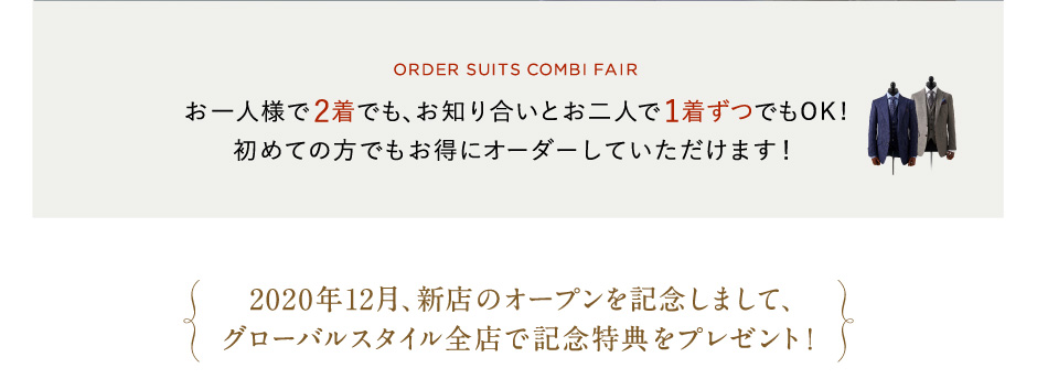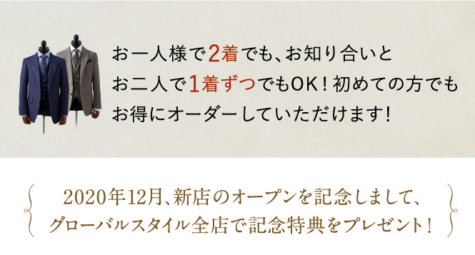 フェア情報のページです。グローバルスタイル(Global Style)では、本格オーダースーツが1着2万円台~!約5,000種類の生地をリーズナブルな価格でご用意しております。東京都・神奈川県(横浜)・埼玉県(大宮)・千葉県・静岡県・愛知県(名古屋)・大阪府(梅田/なんば)・奈良県・京都府・兵庫県(神戸)・広島県・福岡県(天神/博多/北九州)・北海道(札幌)・宮城県(仙台)・熊本県など全国40店舗に展開。