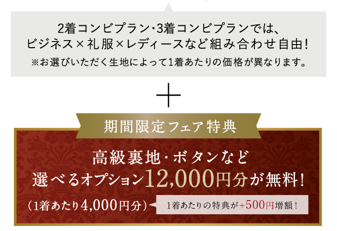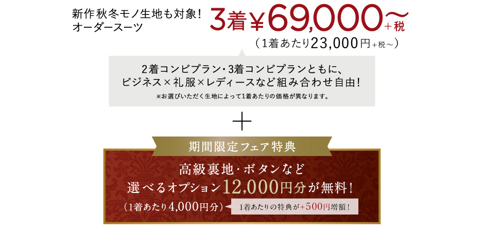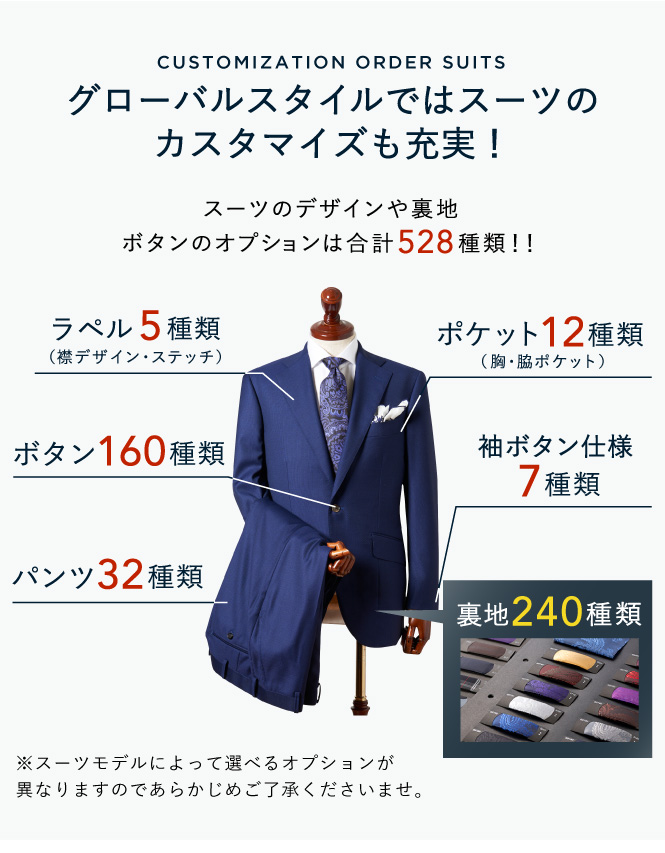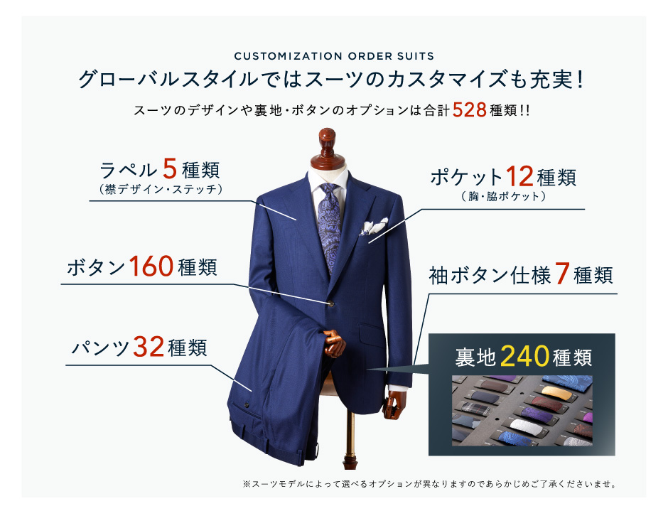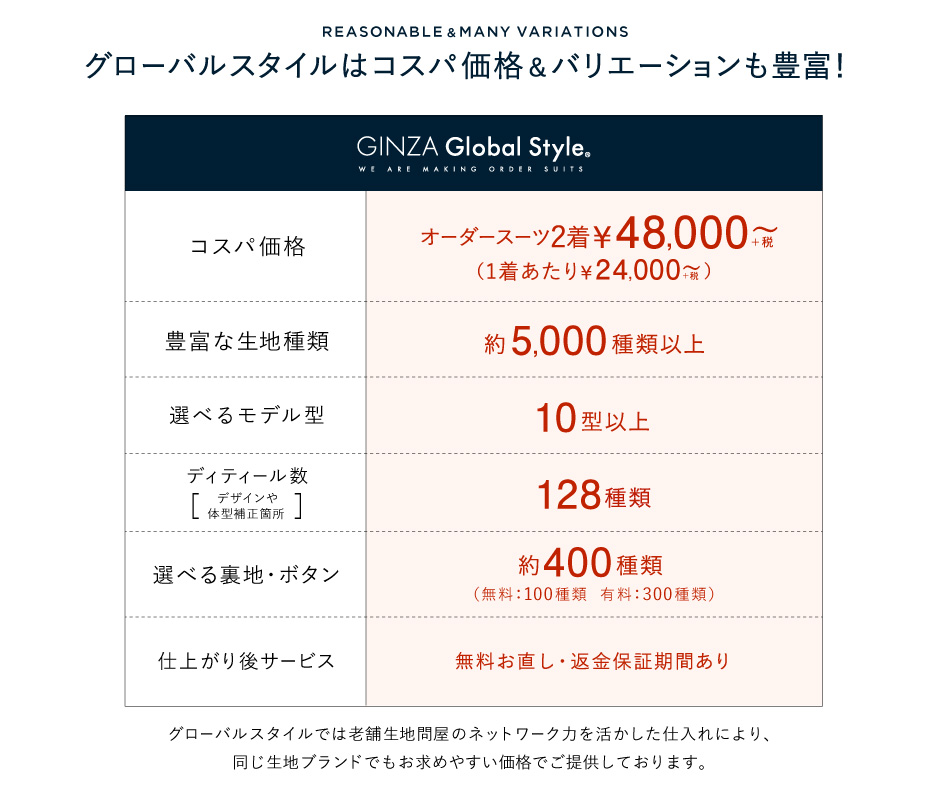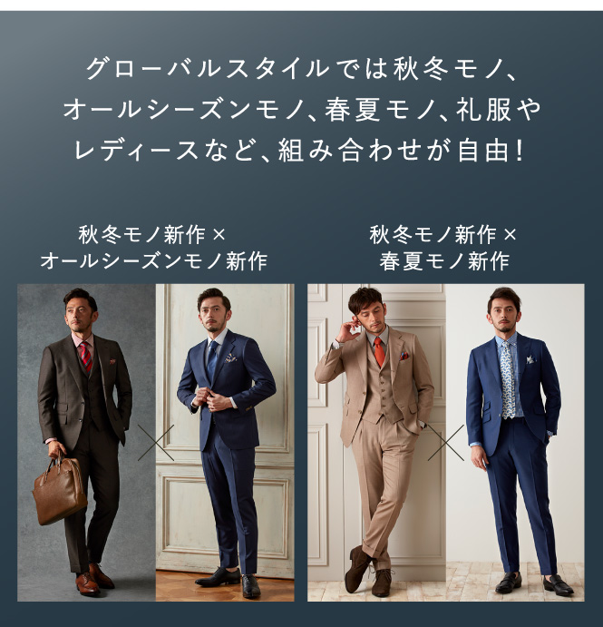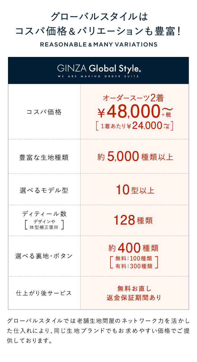 フェア情報のページです。グローバルスタイル(Global Style)では、本格オーダースーツが1着2万円台~!約5,000種類の生地をリーズナブルな価格でご用意しております。東京都・神奈川県(横浜)・埼玉県(大宮)・千葉県・静岡県・愛知県(名古屋)・大阪府(梅田/なんば)・奈良県・京都府・兵庫県(神戸)・広島県・福岡県(天神/博多/北九州)・北海道(札幌)・宮城県(仙台)・熊本県など全国40店舗に展開。