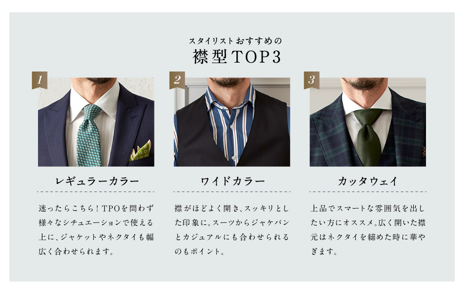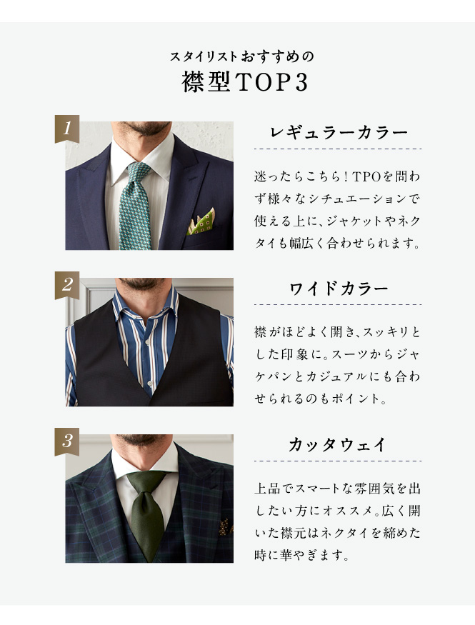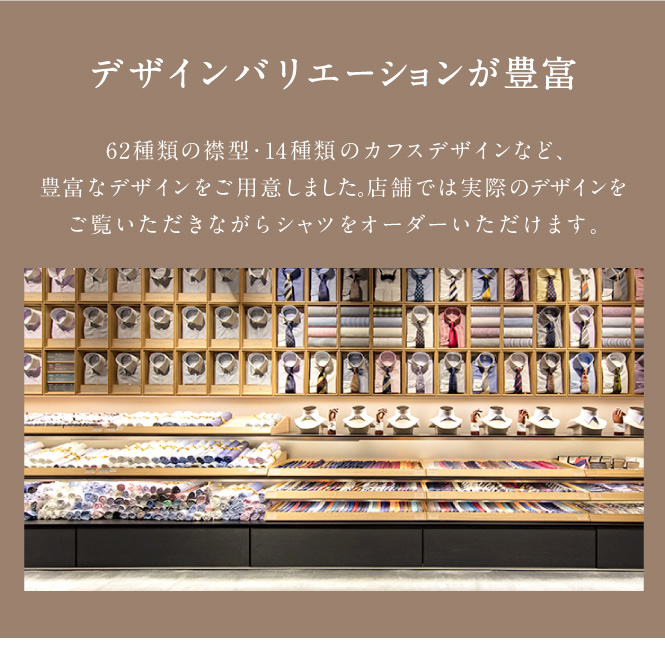 モードからトラッドまでお好みのテイストやTPOに合わせて、62種類の襟型をお選びいただけます。 ※一部有料オプションがございます