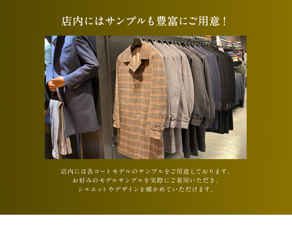 プライベートフィッティングルームのご利用をご希望の方には事前のご予約を頂くようにしておりますが、通常のスーツオーダーについてはご予約なしでご来店いただき、ご注文いただけます。