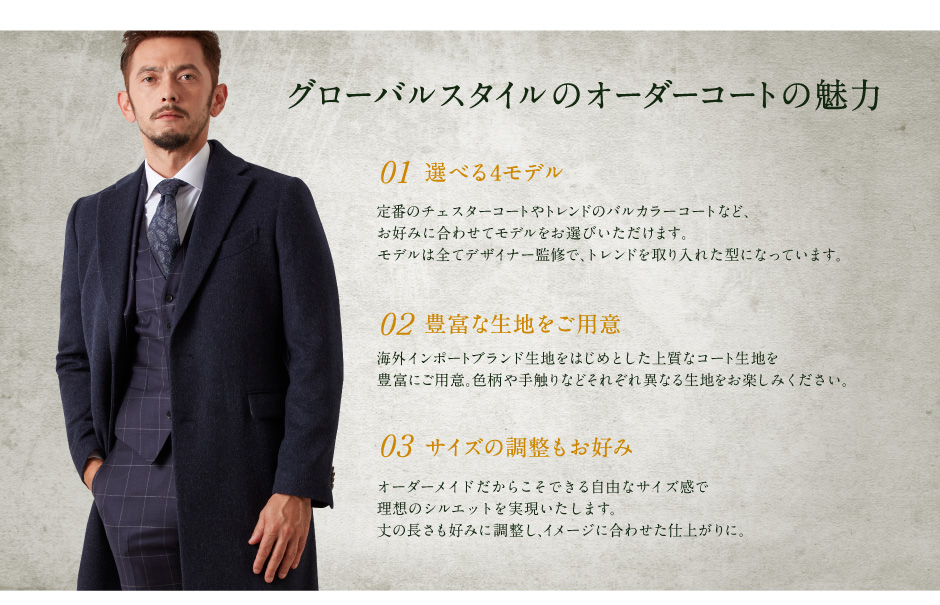 より多くのお客様にオーダーの魅力をお楽しみいただけるお店作りをモットーとするグローバルスタイルの最大の特徴は業界初の「プライベートフィッティングルーム」です。オーダーは既製服と違い、採寸、生地選びとお客様にとってお時間のかかる工程がありますが、その時間を最大にお楽しみいただけるのが当店の特徴です。ご家族、ご友人、会社の同僚の方々と気兼ねなく貸切オーダーをお楽しみください。