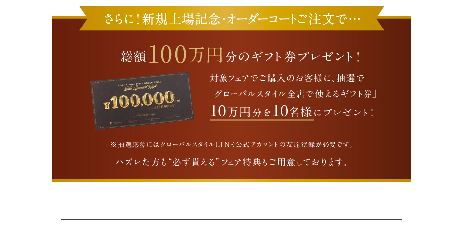 フェア情報のページです。グローバルスタイル(Global Style)では、本格オーダースーツが1着2万円台~!約5,000種類の生地をリーズナブルな価格でご用意しております。東京都・神奈川県(横浜)・埼玉県(大宮)・千葉県・静岡県・愛知県(名古屋)・大阪府(梅田/なんば)・奈良県・京都府・兵庫県(神戸)・広島県・福岡県(天神/博多/北九州)・北海道(札幌)・宮城県(仙台)・熊本県など全国40店舗に展開。