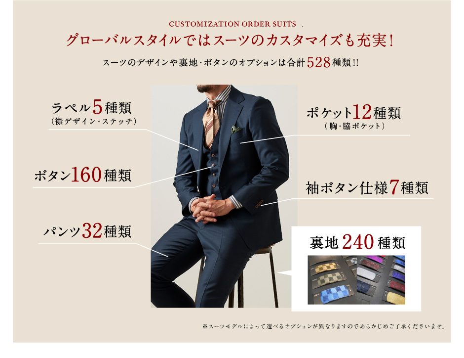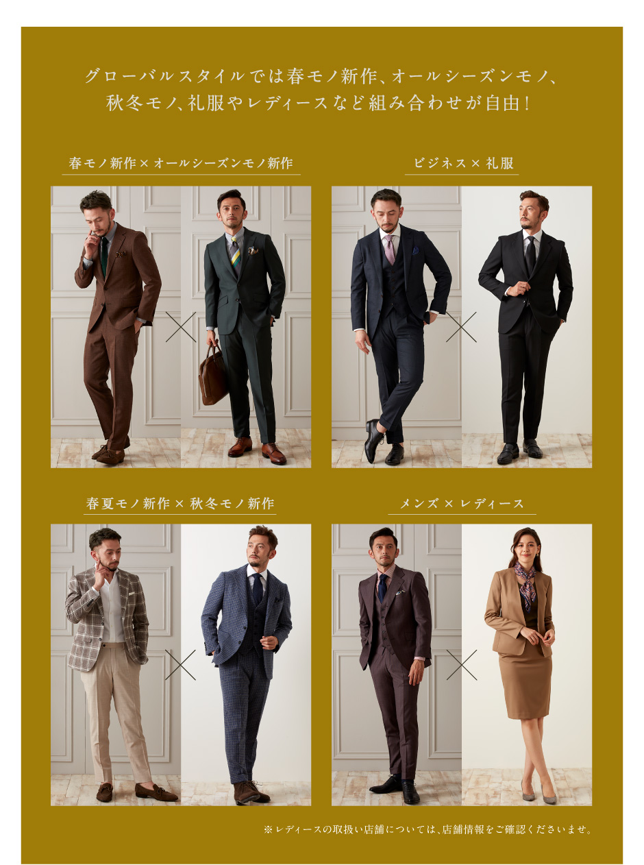 フェア情報のページです。グローバルスタイル(Global Style)では、本格オーダースーツが1着2万円台~!約5,000種類の生地をリーズナブルな価格でご用意しております。東京都・神奈川県(横浜)・埼玉県(大宮)・千葉県・静岡県・愛知県(名古屋)・大阪府(梅田/なんば)・奈良県・京都府・兵庫県(神戸)・広島県・福岡県(天神/博多/北九州)・北海道(札幌)・宮城県(仙台)・熊本県など全国40店舗に展開。