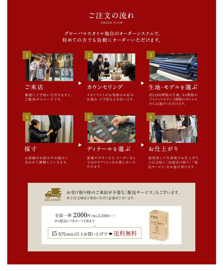 オーダースーツを快適にお作りいただくためのグローバルスタイル独自のサービスです。無料でご使用いただけますのでお気軽にご予約ください。