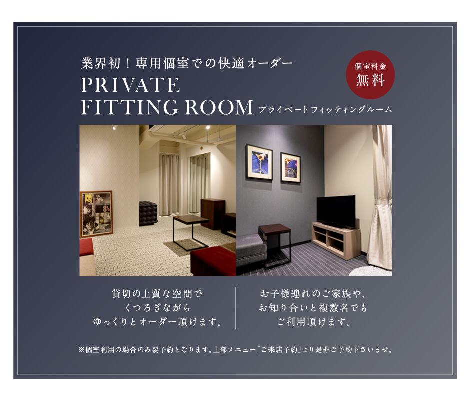 より多くのお客様にオーダーの魅力をお楽しみいただけるお店作りをモットーとするグローバルスタイルの最大の特徴は業界初の「プライベートフィッティングルーム」です。オーダーは既製服と違い、採寸、生地選びとお客様にとってお時間のかかる工程がありますが、その時間を最大にお楽しみいただけるのが当店の特徴です。ご家族、ご友人、会社の同僚の方々と気兼ねなく貸切オーダーをお楽しみください。