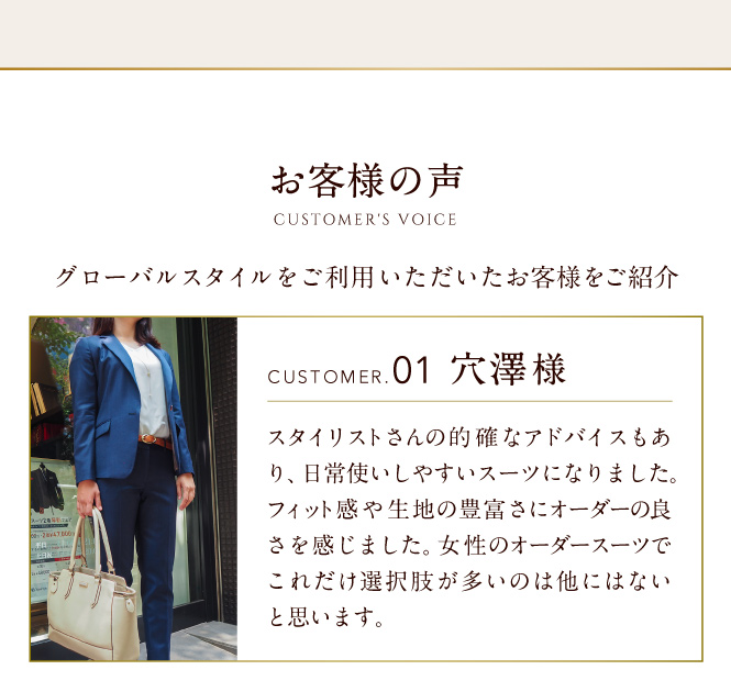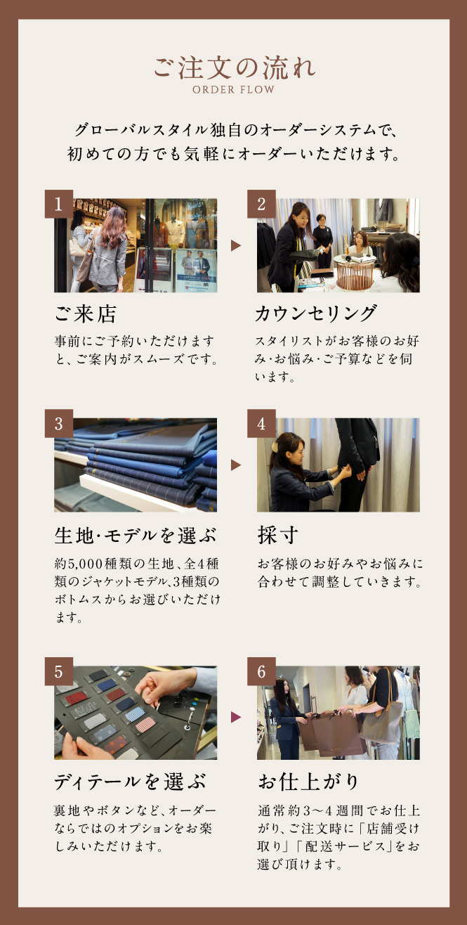 オーダースーツを快適にお作りいただくためのグローバルスタイル独自のサービスです。無料でご使用いただけますのでお気軽にご予約ください。