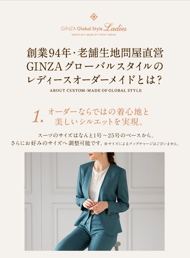 より多くのお客様にオーダーの魅力をお楽しみいただけるお店作りをモットーとするグローバルスタイルの最大の特徴は業界初の「プライベートフィッティングルーム」です。オーダーは既製服と違い、採寸、生地選びとお客様にとってお時間のかかる工程がありますが、その時間を最大にお楽しみいただけるのが当店の特徴です。ご家族、ご友人、会社の同僚の方々と気兼ねなく貸切オーダーをお楽しみください。