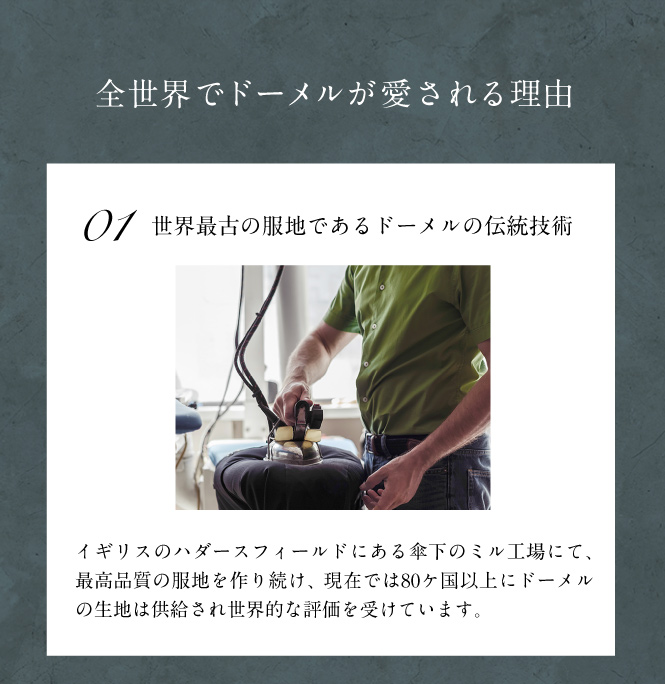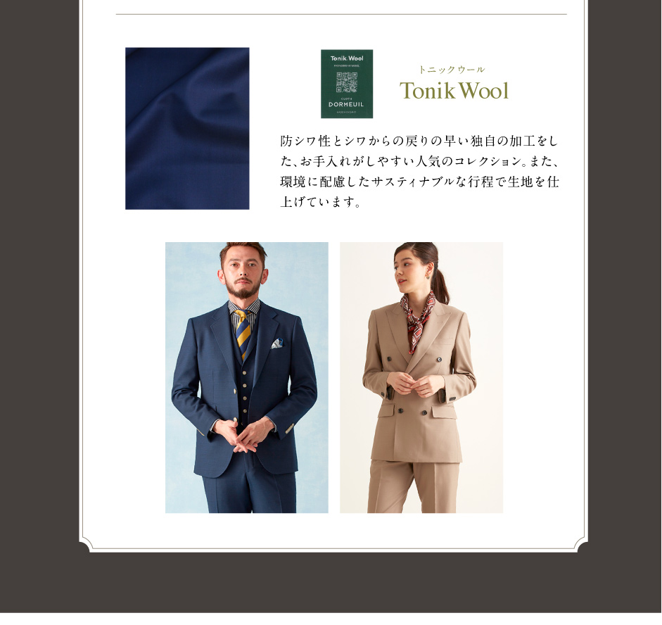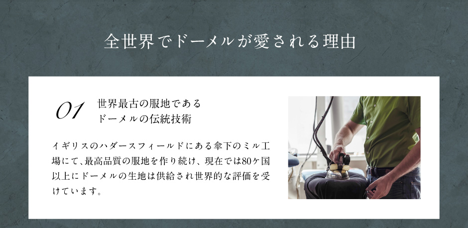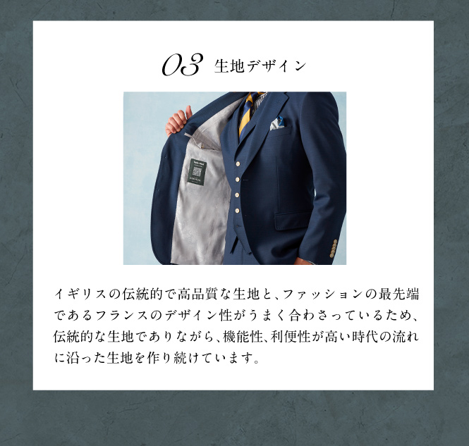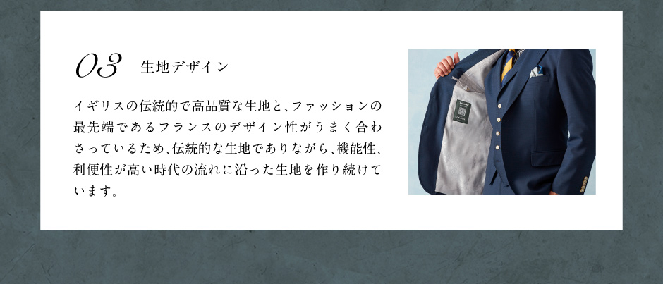 従来からある重厚な英国風仕立てを アレンジして薄めのパットやソフトな毛芯を用いています。 デザイン的にも高めの釦位置や強調された 裾のカッタウェイライン、スラントやチェンジポケットなど ブリテッシュスタイルの新しい息吹を体感して下さい。