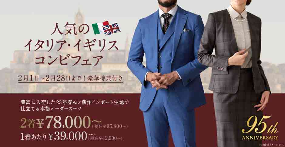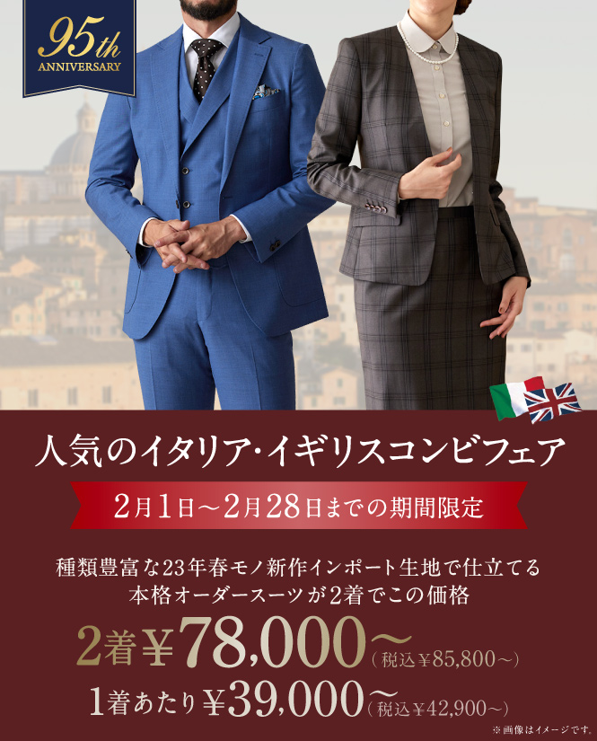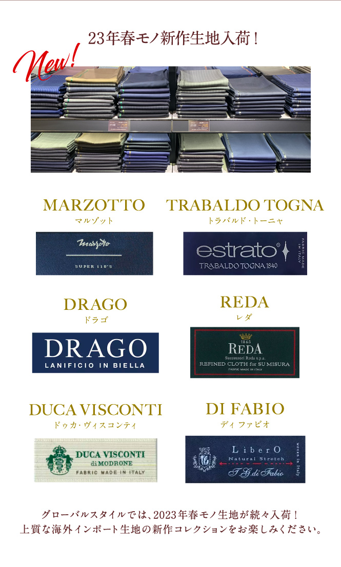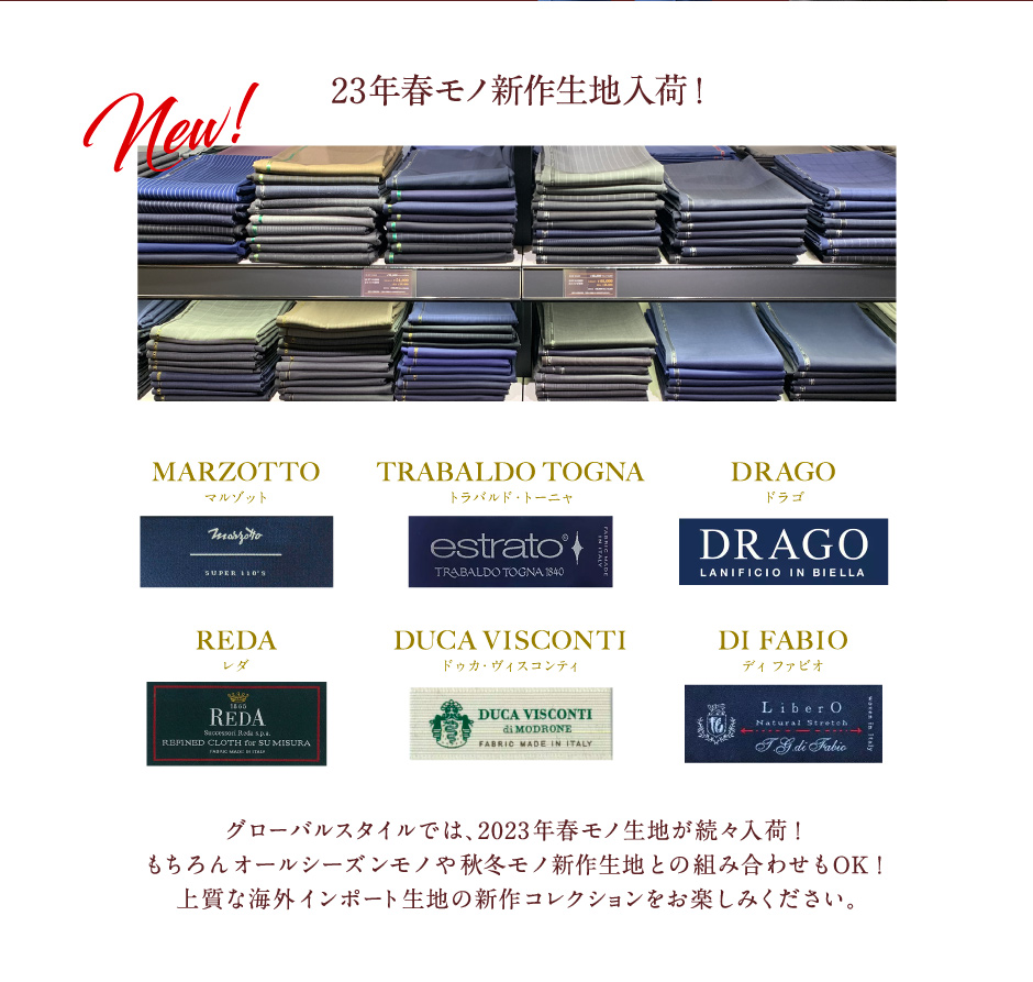 フェア情報のページです。グローバルスタイル(Global Style)では、本格オーダースーツが1着2万円台~!約5,000種類の生地をリーズナブルな価格でご用意しております。東京都・神奈川県(横浜)・埼玉県(大宮)・千葉県・静岡県・愛知県(名古屋)・大阪府(梅田/なんば)・奈良県・京都府・兵庫県(神戸)・広島県・福岡県(天神/博多/北九州)・北海道(札幌)・宮城県(仙台)・熊本県など全国40店舗に展開。