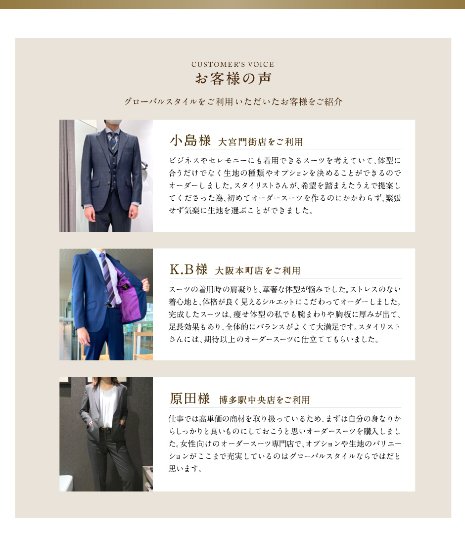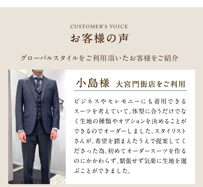 オーダースーツを快適にお作りいただくためのグローバルスタイル独自のサービスです。無料でご使用いただけますのでお気軽にご予約ください。