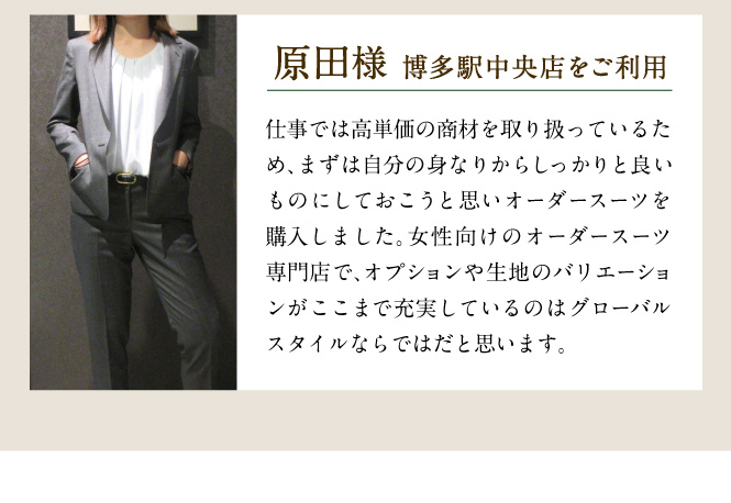 より多くのお客様にオーダーの魅力をお楽しみいただけるお店作りをモットーとするグローバルスタイルの最大の特徴は業界初の「プライベートフィッティングルーム」です。オーダーは既製服と違い、採寸、生地選びとお客様にとってお時間のかかる工程がありますが、その時間を最大にお楽しみいただけるのが当店の特徴です。ご家族、ご友人、会社の同僚の方々と気兼ねなく貸切オーダーをお楽しみください。