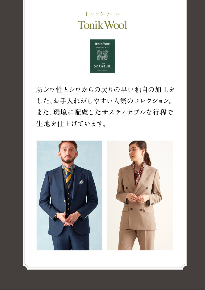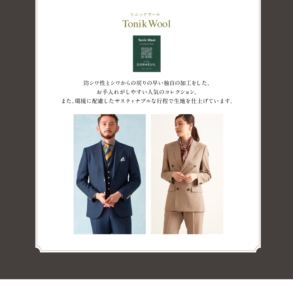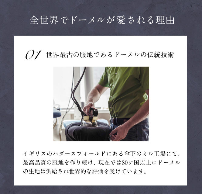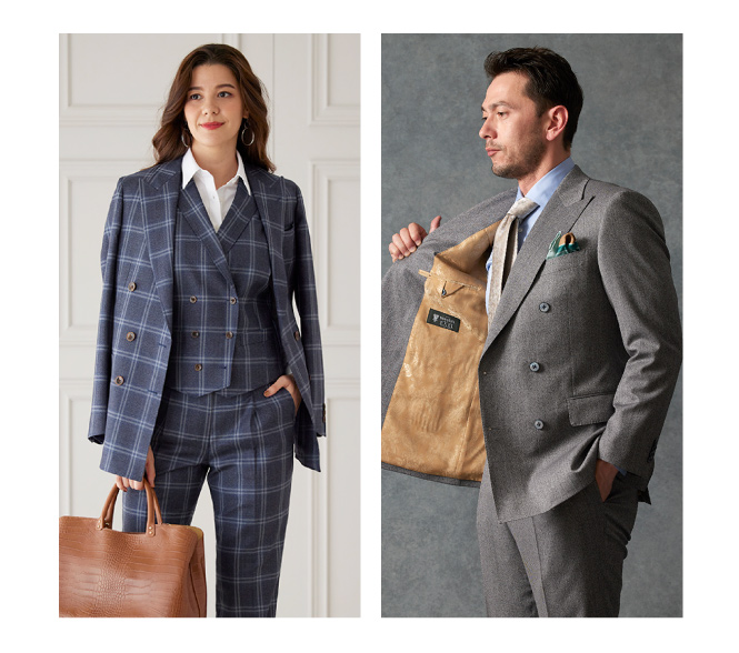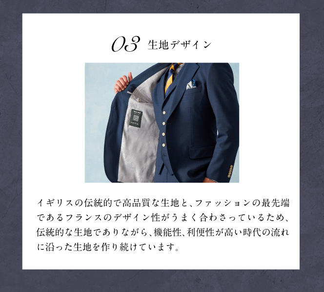 従来からある重厚な英国風仕立てを アレンジして薄めのパットやソフトな毛芯を用いています。 デザイン的にも高めの釦位置や強調された 裾のカッタウェイライン、スラントやチェンジポケットなど ブリテッシュスタイルの新しい息吹を体感して下さい。