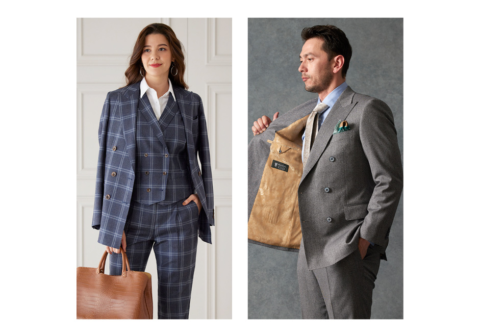 ハイゴージ、9.5cm幅のワイドピークドラペルが70年代のコンチネンタルスタイルを彷彿させる男性らしさを強調し、現代的な仕立ての軽さやタイト感あるシルエットによりクラシックとモダンの絶妙なバランス感を生み出しています。