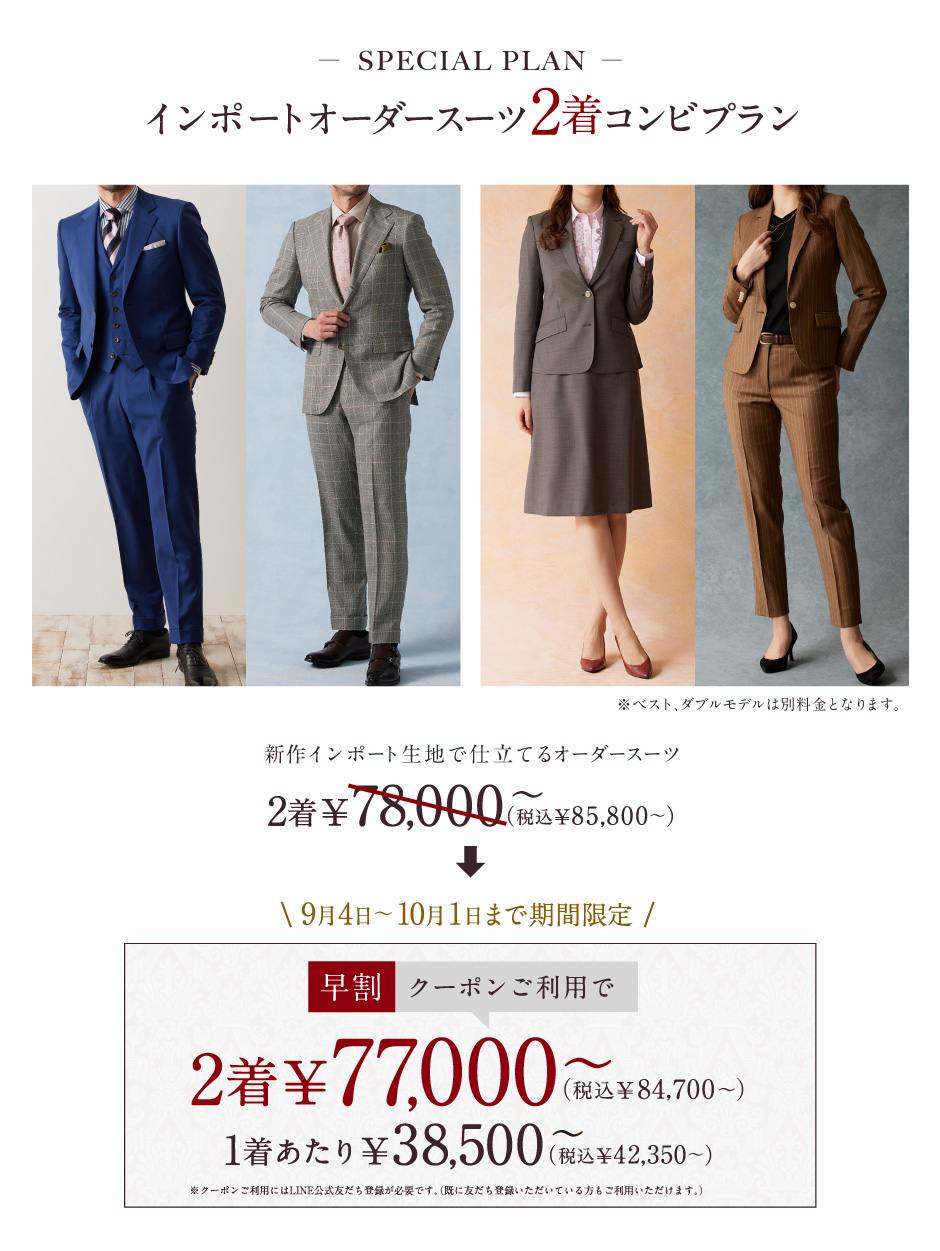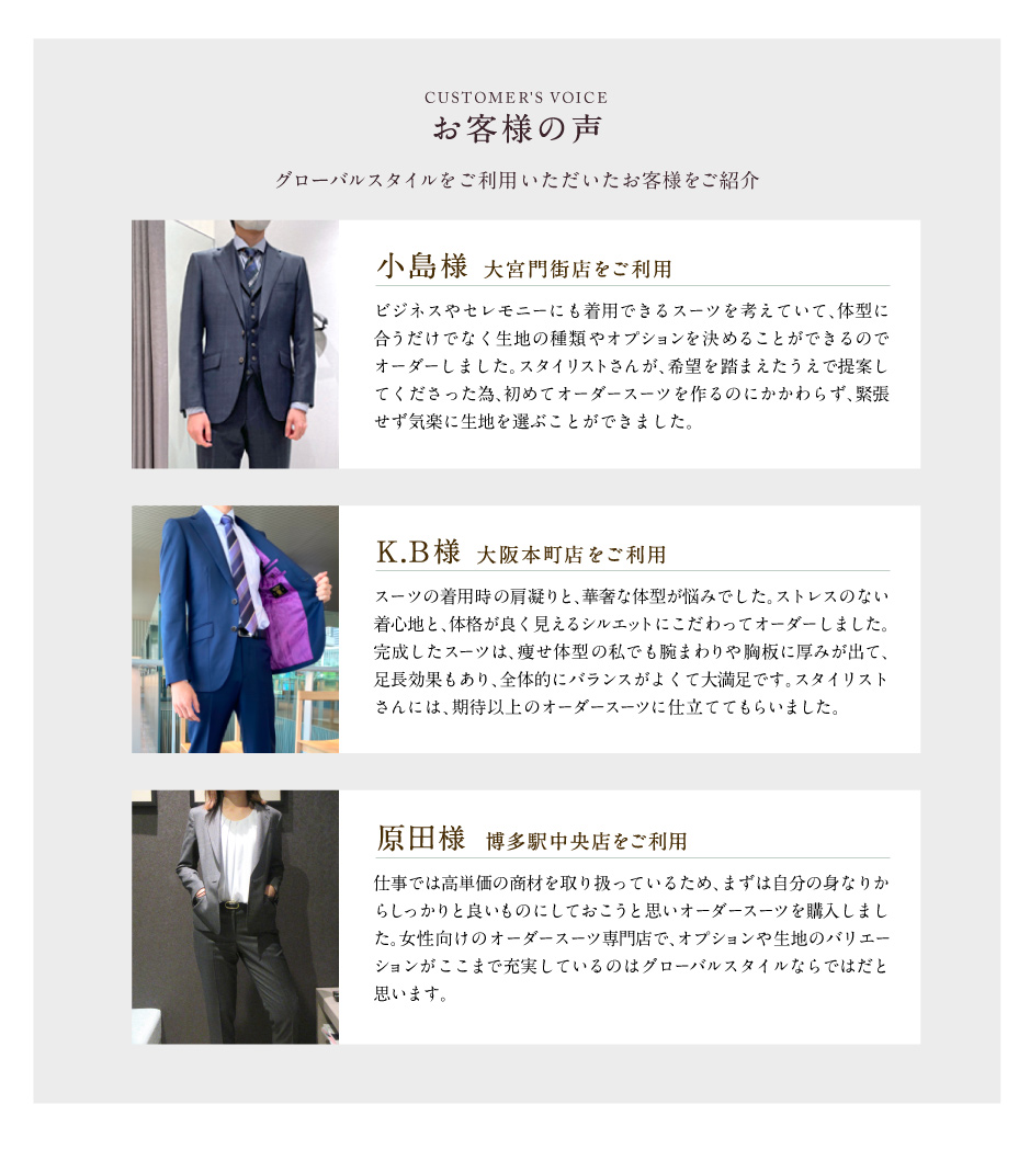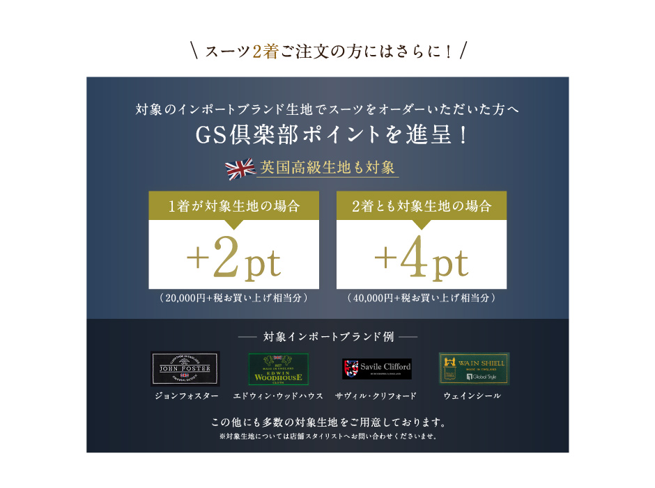 フェア情報のページです。グローバルスタイル(Global Style)では、本格オーダースーツが1着2万円台~!約5,000種類の生地をリーズナブルな価格でご用意しております。東京都・神奈川県(横浜)・埼玉県(大宮)・千葉県・静岡県・愛知県(名古屋)・大阪府(梅田/なんば)・奈良県・京都府・兵庫県(神戸)・広島県・福岡県(天神/博多/北九州)・北海道(札幌)・宮城県(仙台)・熊本県など全国40店舗に展開。