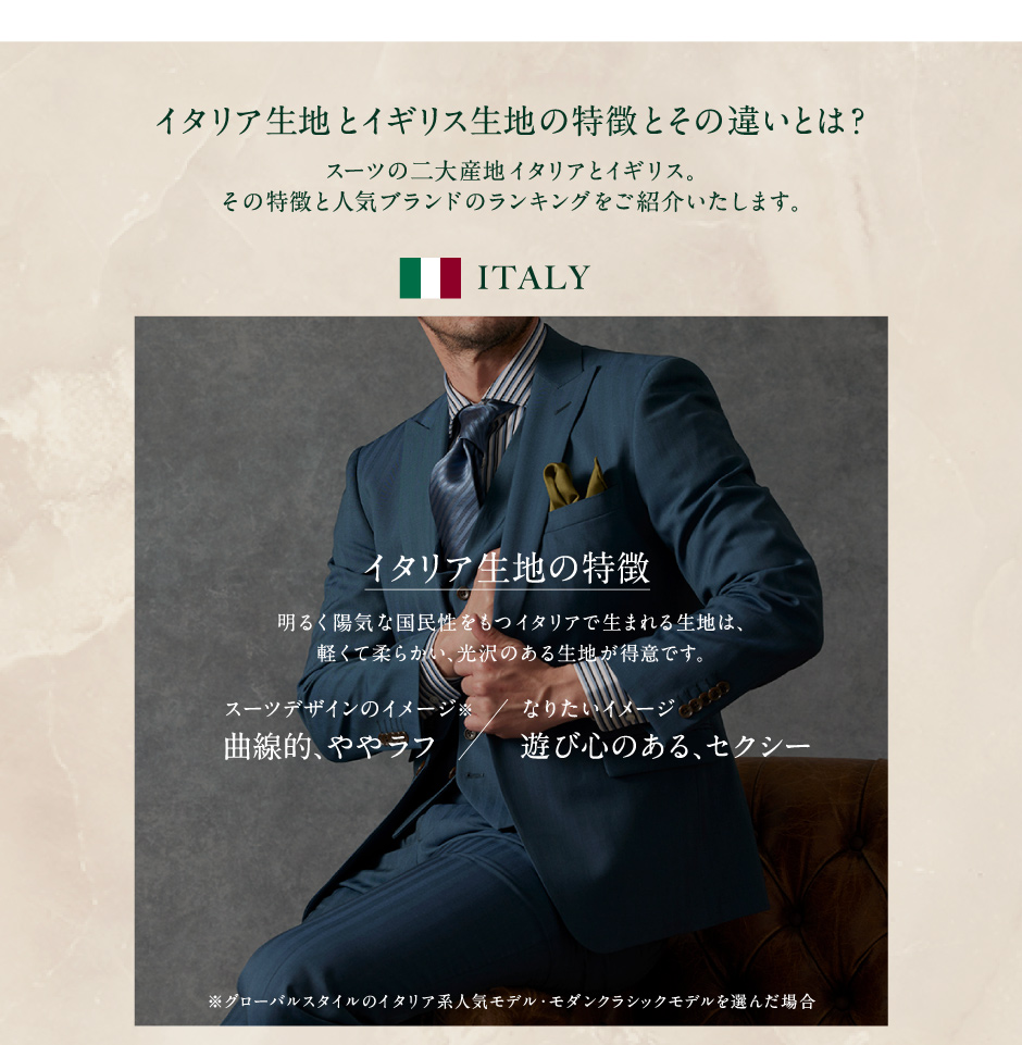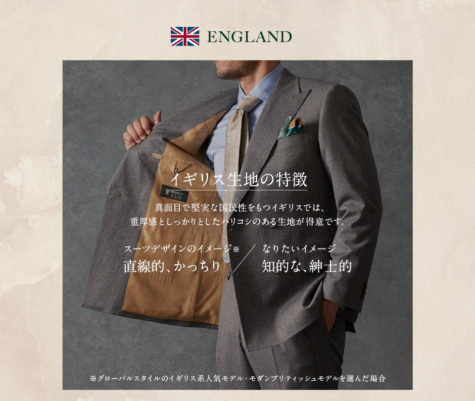 従来からある重厚な英国風仕立てを アレンジして薄めのパットやソフトな毛芯を用いています。 デザイン的にも高めの釦位置や強調された 裾のカッタウェイライン、スラントやチェンジポケットなど ブリテッシュスタイルの新しい息吹を体感して下さい。