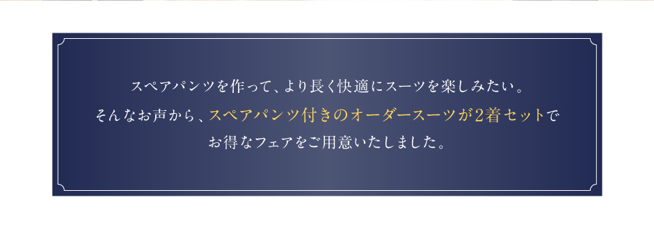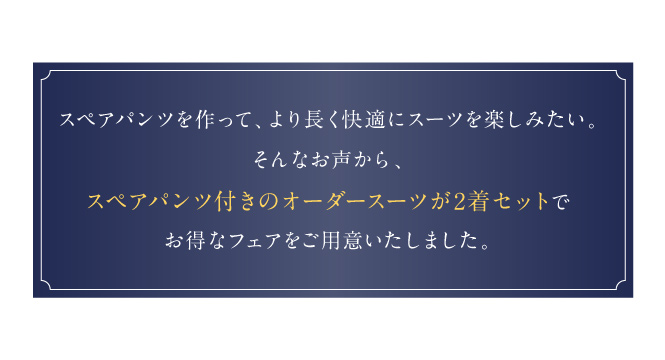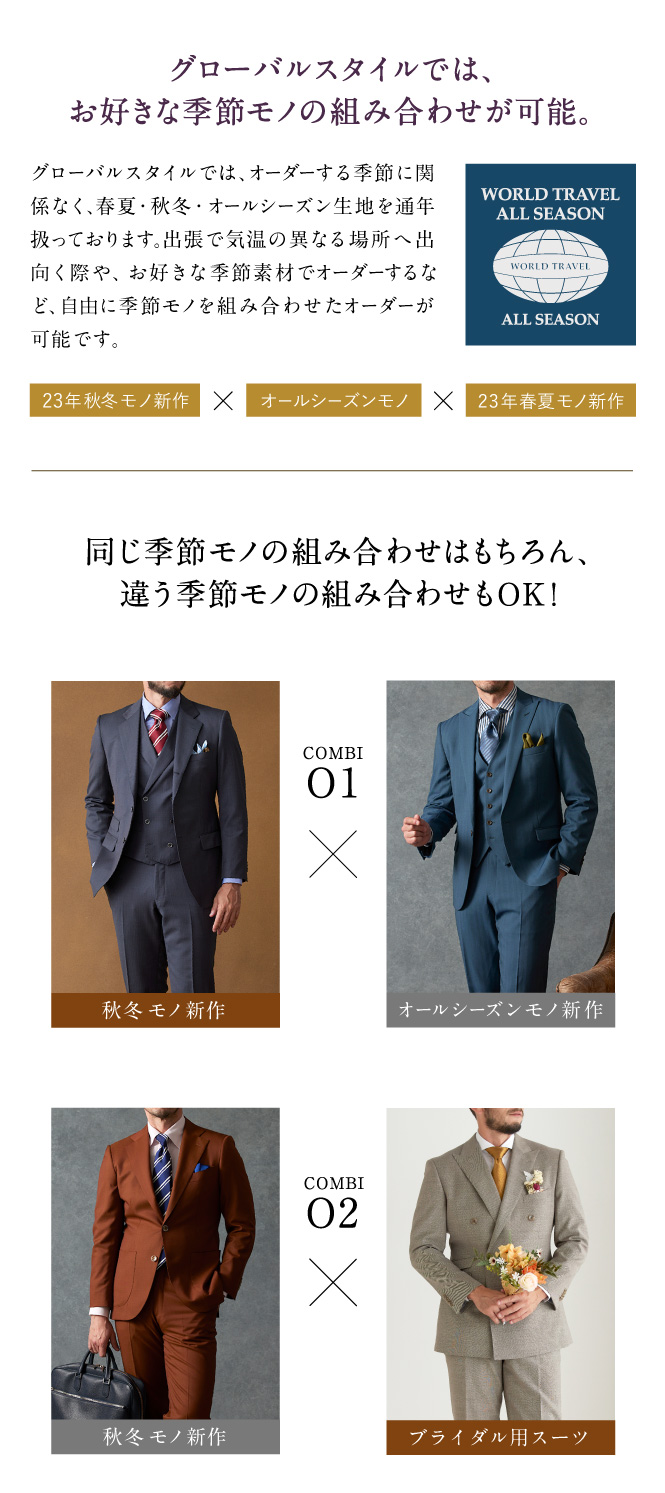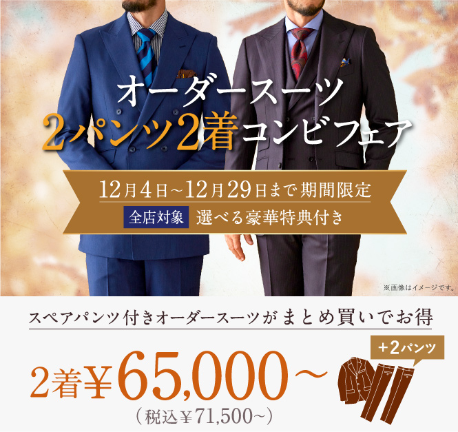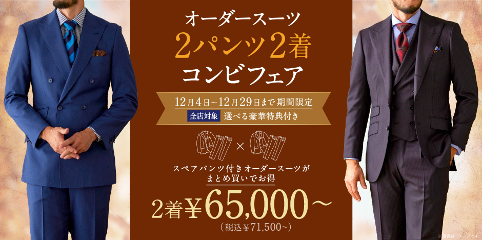 フェア情報のページです。グローバルスタイル(Global Style)では、本格オーダースーツが1着2万円台~!約5,000種類の生地をリーズナブルな価格でご用意しております。東京都・神奈川県(横浜)・埼玉県(大宮)・千葉県・静岡県・愛知県(名古屋)・大阪府(梅田/なんば)・奈良県・京都府・兵庫県(神戸)・広島県・福岡県(天神/博多/北九州)・北海道(札幌)・宮城県(仙台)・熊本県など全国40店舗に展開。