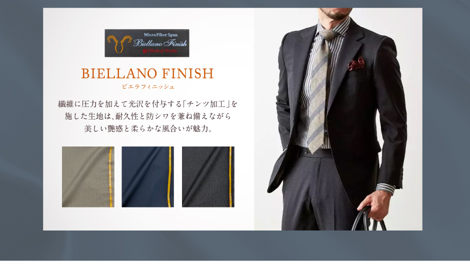 従来からある重厚な英国風仕立てを アレンジして薄めのパットやソフトな毛芯を用いています。 デザイン的にも高めの釦位置や強調された 裾のカッタウェイライン、スラントやチェンジポケットなど ブリテッシュスタイルの新しい息吹を体感して下さい。