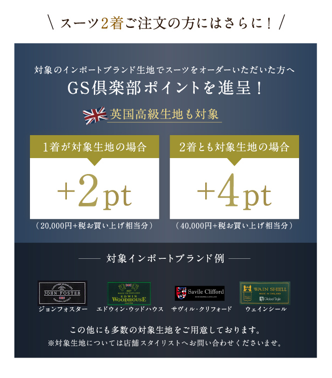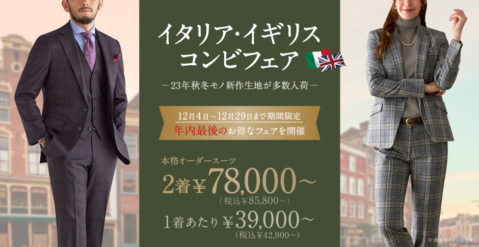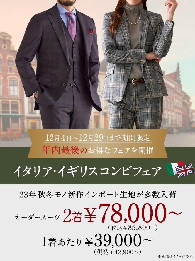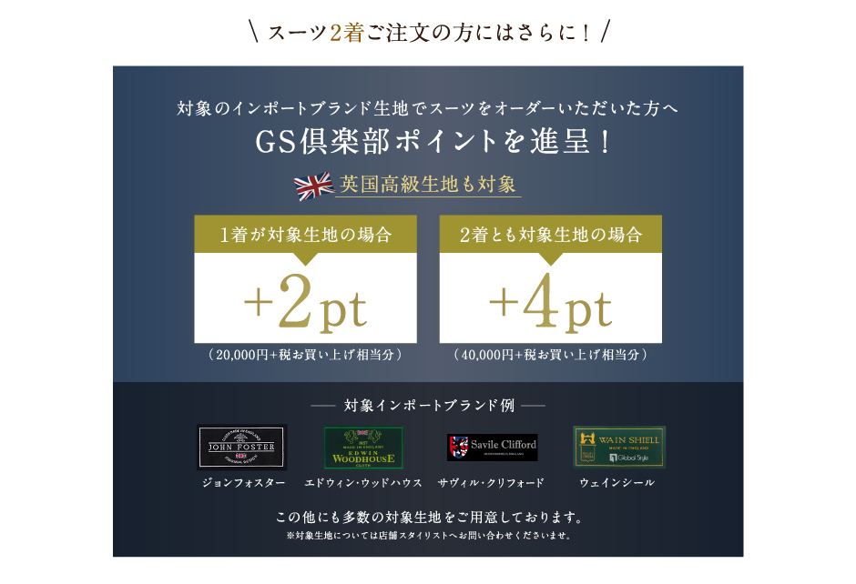 フェア情報のページです。グローバルスタイル(Global Style)では、本格オーダースーツが1着2万円台~!約5,000種類の生地をリーズナブルな価格でご用意しております。東京都・神奈川県(横浜)・埼玉県(大宮)・千葉県・静岡県・愛知県(名古屋)・大阪府(梅田/なんば)・奈良県・京都府・兵庫県(神戸)・広島県・福岡県(天神/博多/北九州)・北海道(札幌)・宮城県(仙台)・熊本県など全国40店舗に展開。