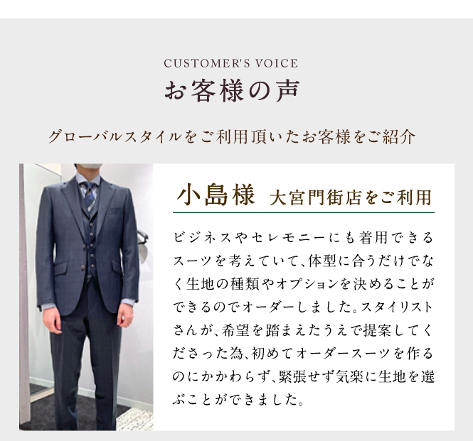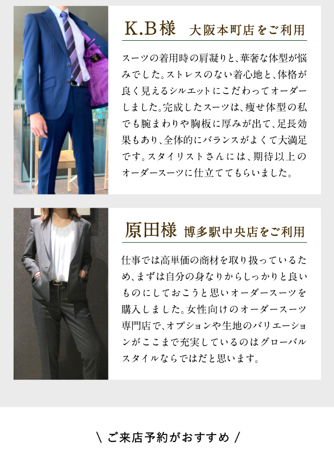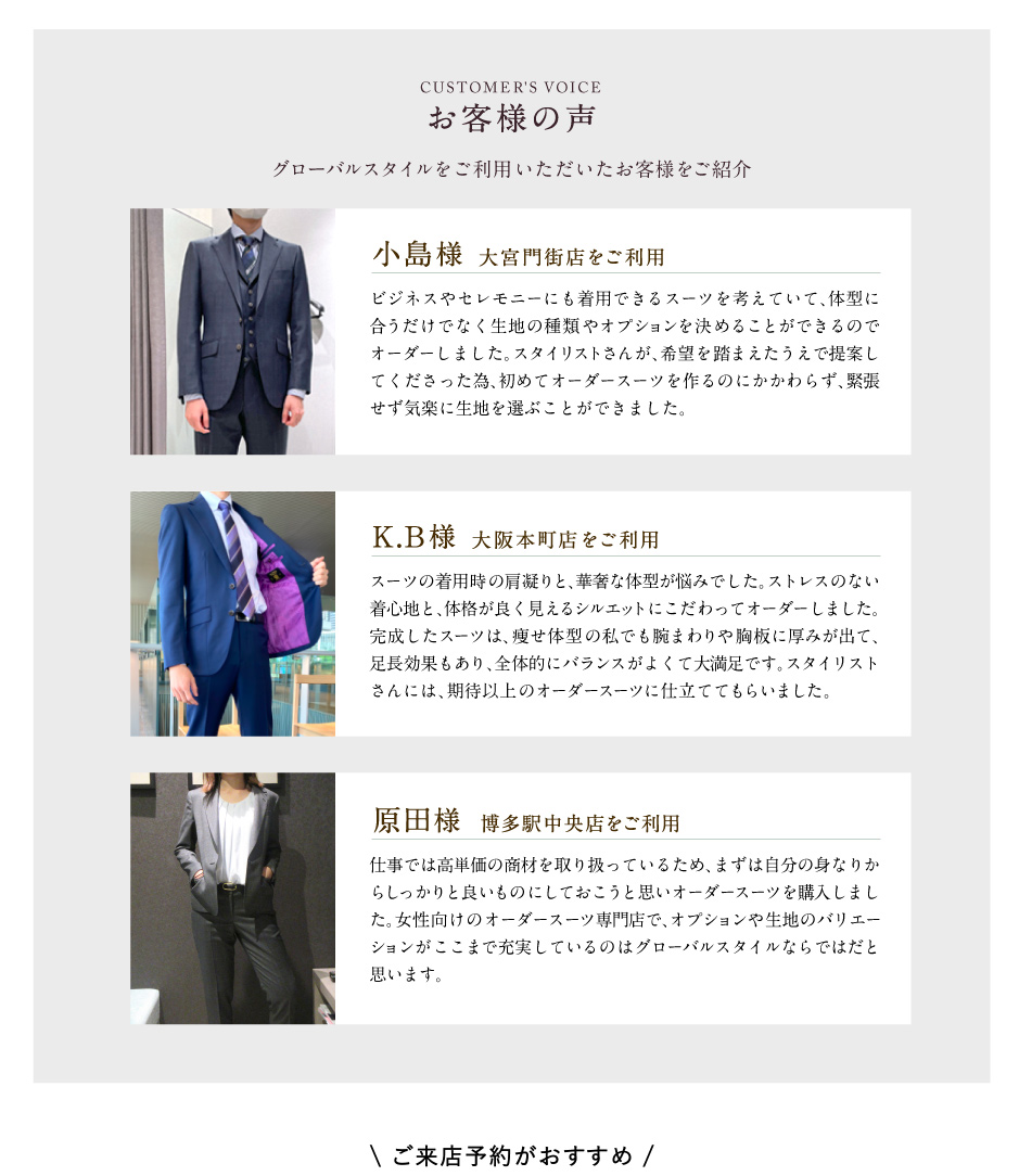 オーダースーツを快適にお作りいただくためのグローバルスタイル独自のサービスです。無料でご使用いただけますのでお気軽にご予約ください。