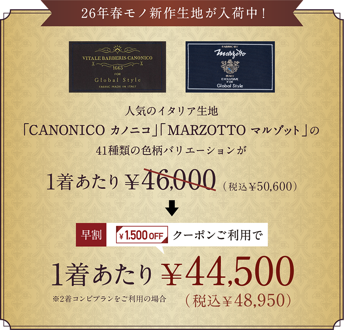 オーダーコート1着 ¥49,000〜 (税込¥53,900〜)