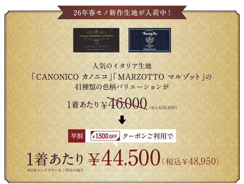 フェア特別価格の1着あたり¥22,500(税込¥24,750)のオーダースーツ生地は