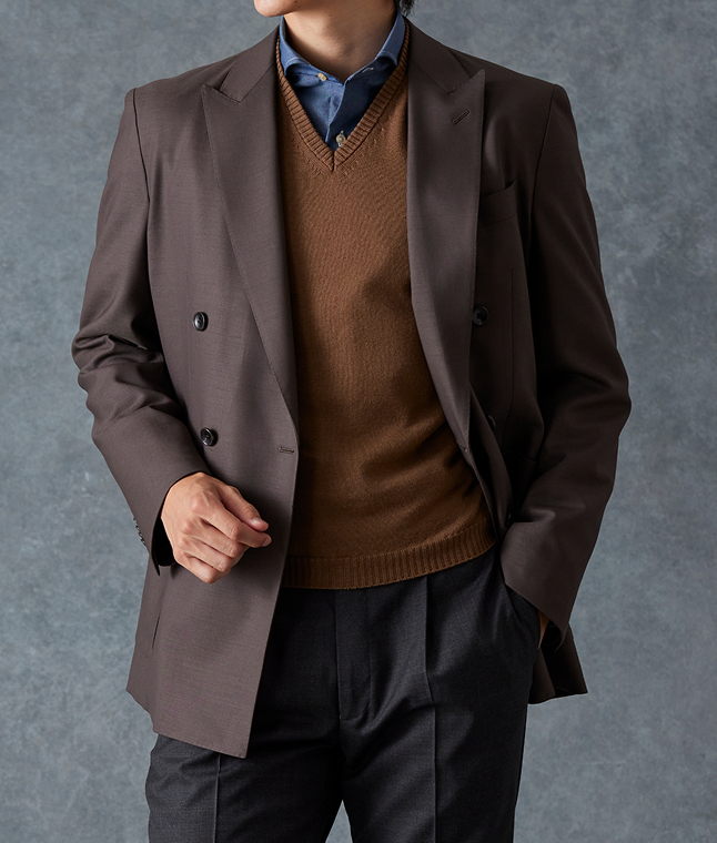 ハイゴージ、9.5cm幅のワイドピークドラペルが70年代のコンチネンタルスタイルを彷彿させる男性らしさを強調し、現代的な仕立ての軽さやタイト感あるシルエットによりクラシックとモダンの絶妙なバランス感を生み出しています。