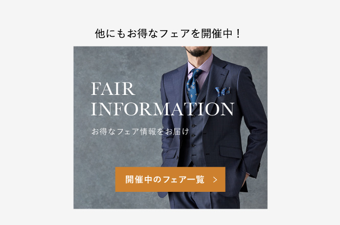 フェア情報のページです。グローバルスタイル(Global Style)では、本格オーダースーツが1着2万円台~!約5,000種類の生地をリーズナブルな価格でご用意しております。東京都・神奈川県(横浜)・埼玉県(大宮)・千葉県・静岡県・愛知県(名古屋)・大阪府(梅田/なんば)・奈良県・京都府・兵庫県(神戸)・広島県・福岡県(天神/博多/北九州)・北海道(札幌)・宮城県(仙台)・熊本県など全国40店舗に展開。