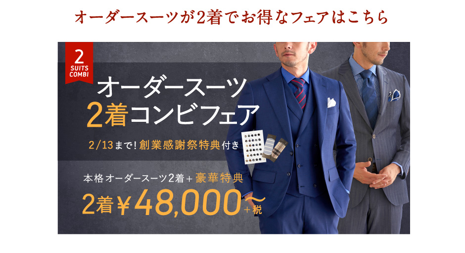 フェア情報のページです。グローバルスタイル(Global Style)では、本格オーダースーツが1着2万円台~!約5,000種類の生地をリーズナブルな価格でご用意しております。東京都・神奈川県(横浜)・埼玉県(大宮)・千葉県・静岡県・愛知県(名古屋)・大阪府(梅田/なんば)・奈良県・京都府・兵庫県(神戸)・広島県・福岡県(天神/博多/北九州)・北海道(札幌)・宮城県(仙台)・熊本県など全国40店舗に展開。
