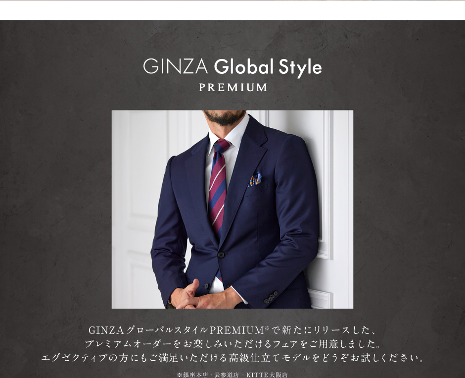 フェア情報のページです。グローバルスタイル(Global Style)では、本格オーダースーツが1着2万円台~!約5,000種類の生地をリーズナブルな価格でご用意しております。東京都・神奈川県(横浜)・埼玉県(大宮)・千葉県・静岡県・愛知県(名古屋)・大阪府(梅田/なんば)・奈良県・京都府・兵庫県(神戸)・広島県・福岡県(天神/博多/北九州)・北海道(札幌)・宮城県(仙台)・熊本県など全国40店舗に展開。