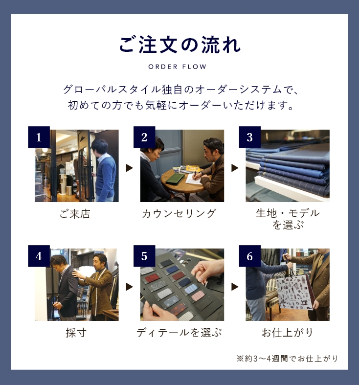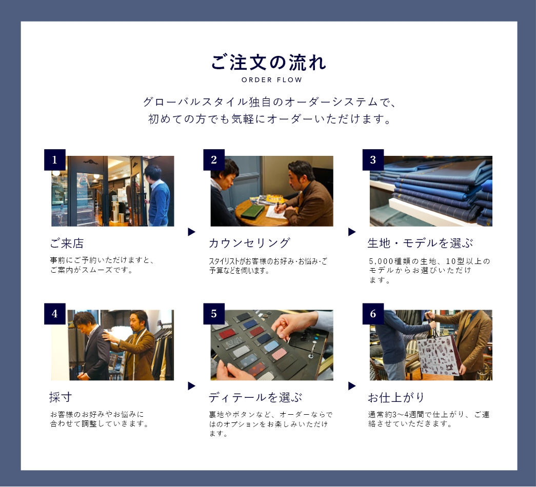 グローバルスタイルではお客様ひとりひとりに専属スタイリストが付きオーダーをサポートします。