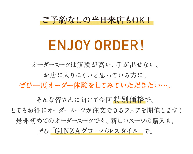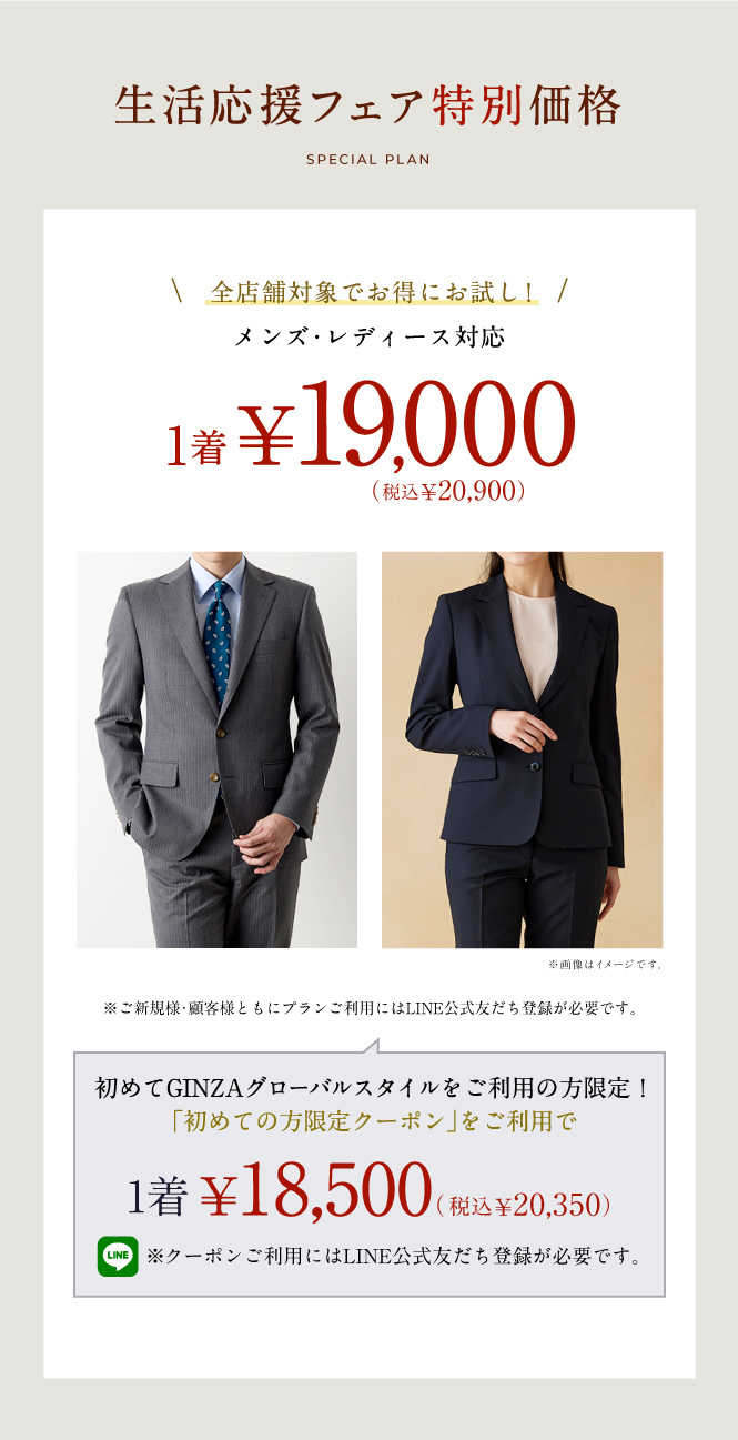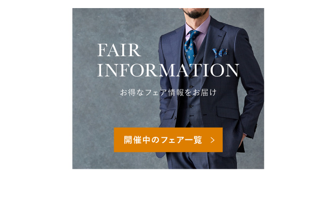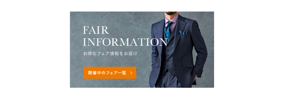 フェア情報のページです。グローバルスタイル(Global Style)では、本格オーダースーツが1着2万円台~!約5,000種類の生地をリーズナブルな価格でご用意しております。東京都・神奈川県(横浜)・埼玉県(大宮)・千葉県・静岡県・愛知県(名古屋)・大阪府(梅田/なんば)・奈良県・京都府・兵庫県(神戸)・広島県・福岡県(天神/博多/北九州)・北海道(札幌)・宮城県(仙台)・熊本県など全国40店舗に展開。