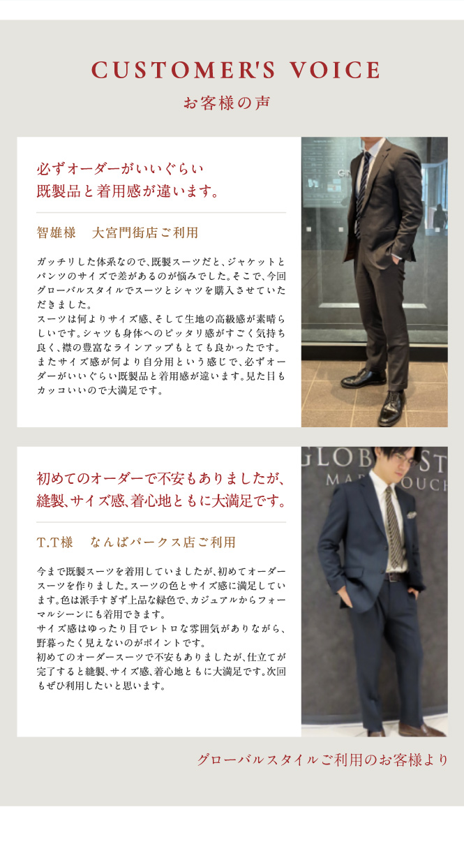 オーダースーツを快適にお作りいただくためのグローバルスタイル独自のサービスです。無料でご使用いただけますのでお気軽にご予約ください。