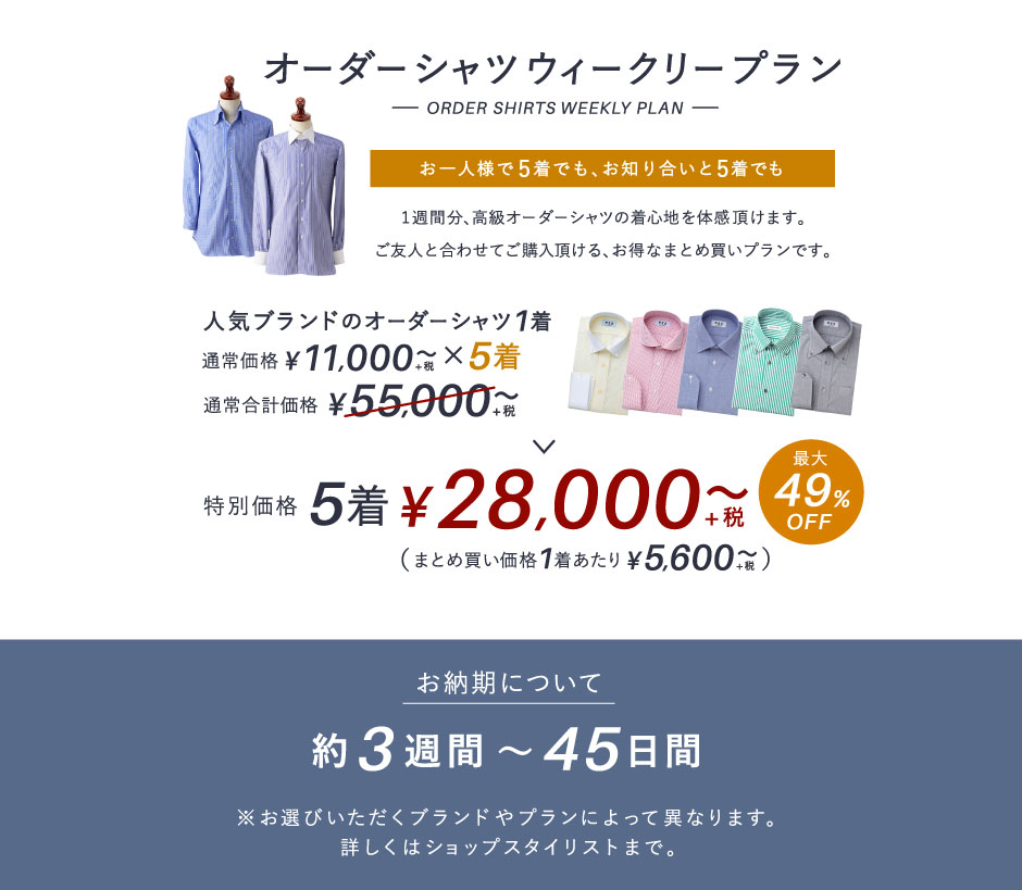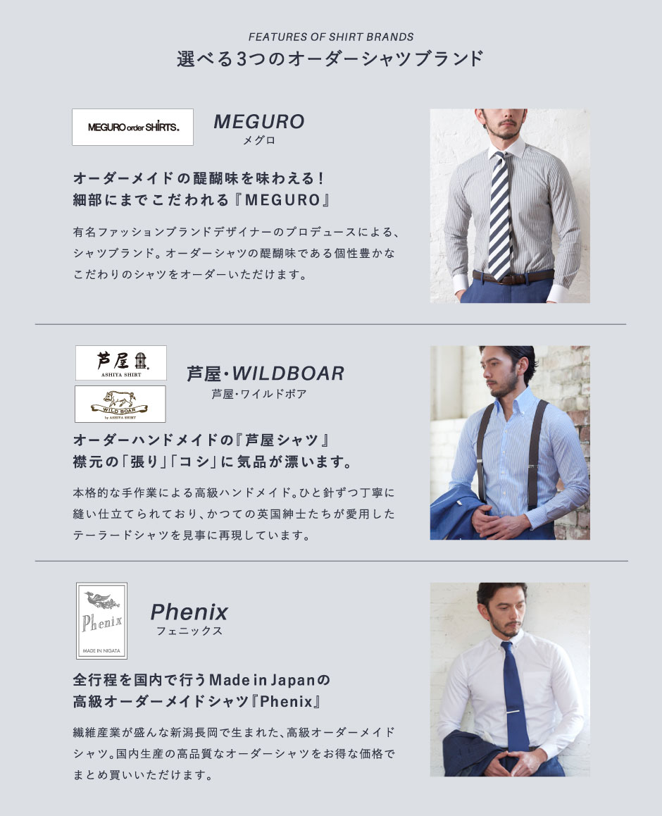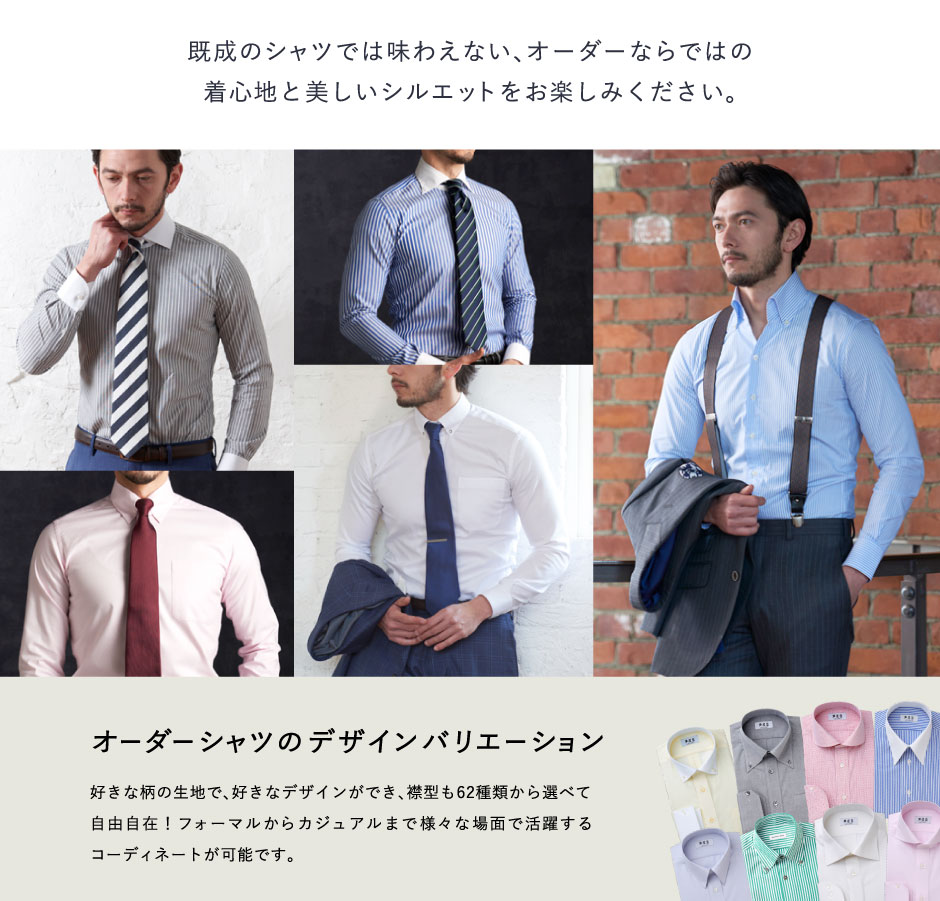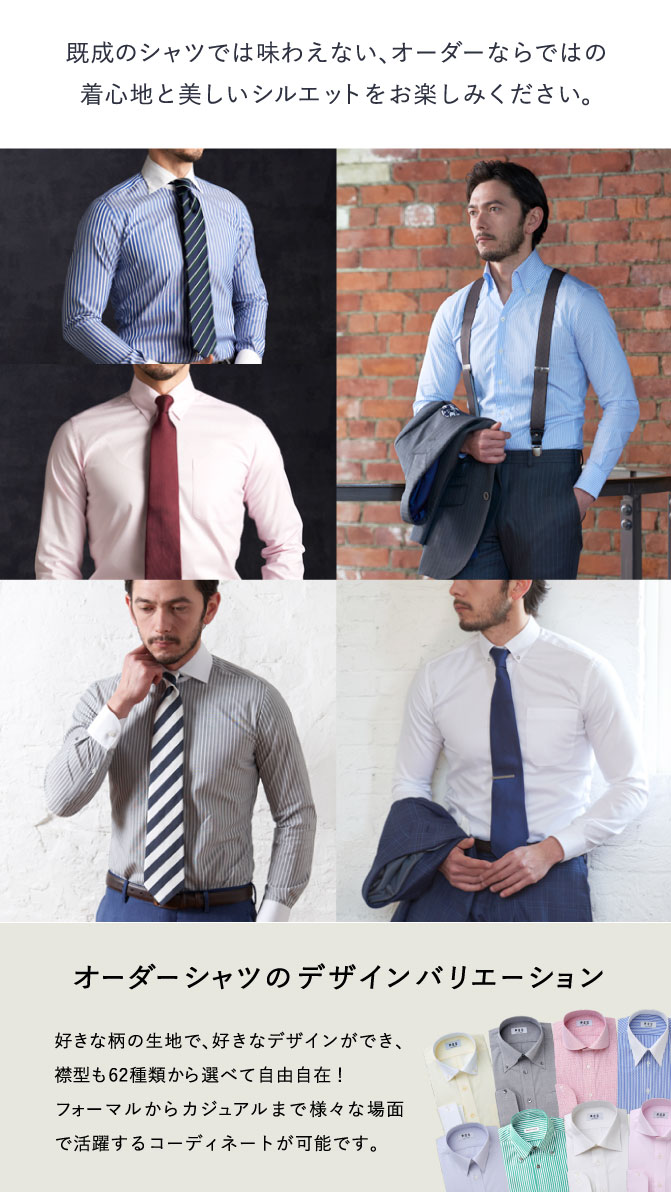 モードからトラッドまでお好みのテイストやTPOに合わせて、62種類の襟型をお選びいただけます。 ※一部有料オプションがございます