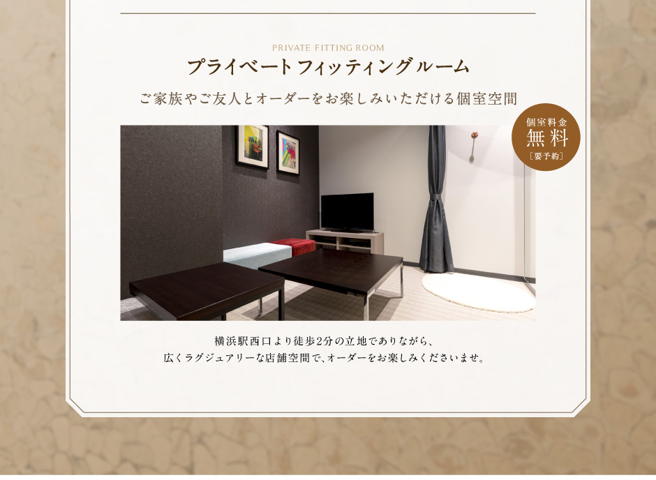 プライベートフィッティングルームのご利用をご希望の方には事前のご予約を頂くようにしておりますが、通常のスーツオーダーについてはご予約なしでご来店いただき、ご注文いただけます。